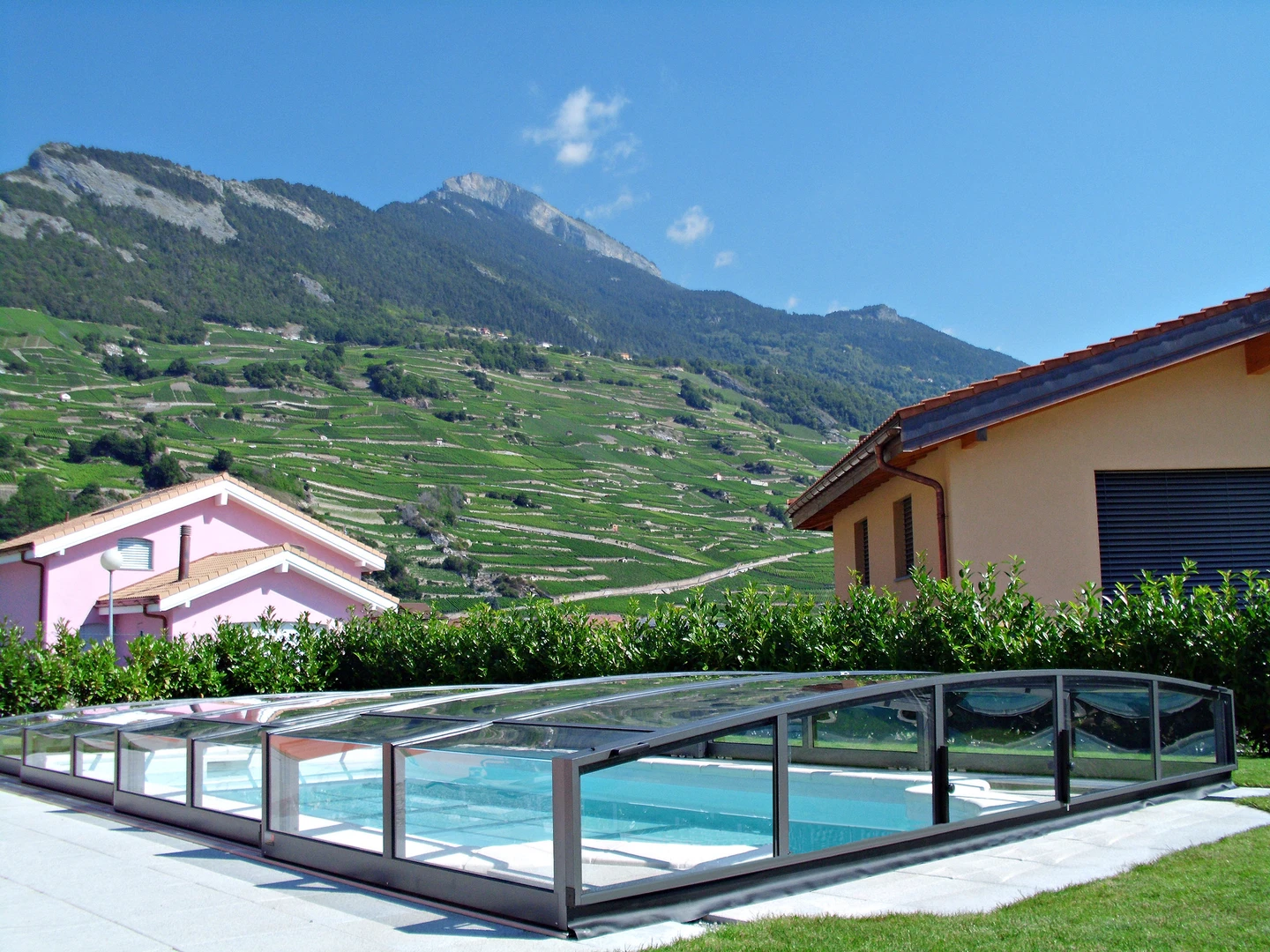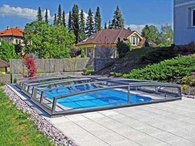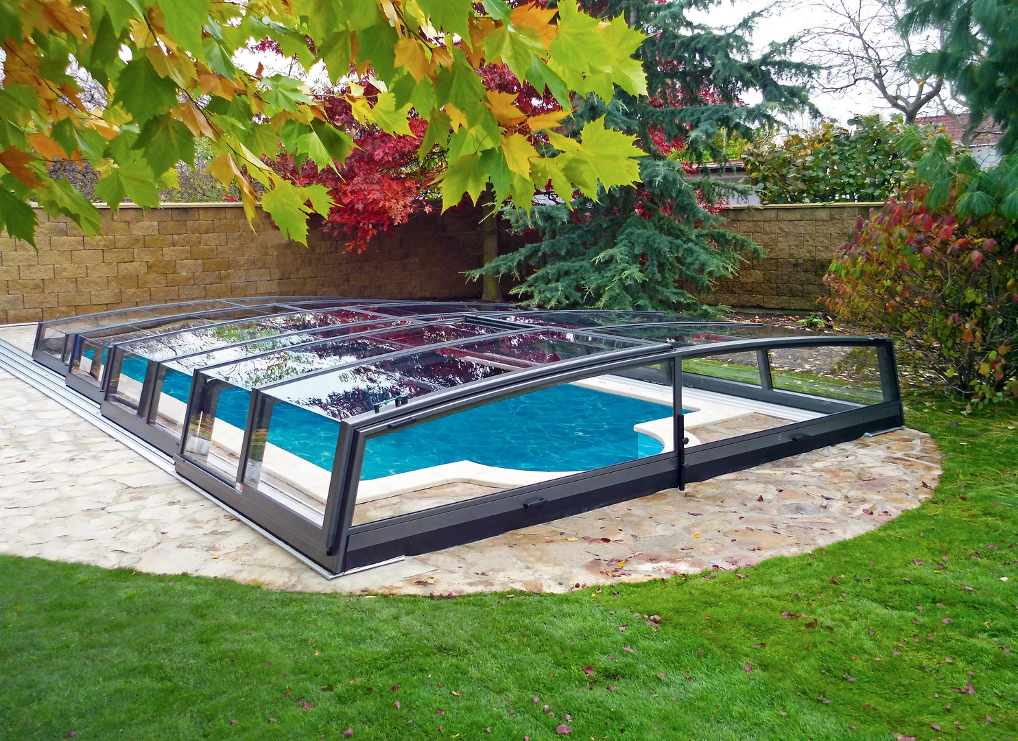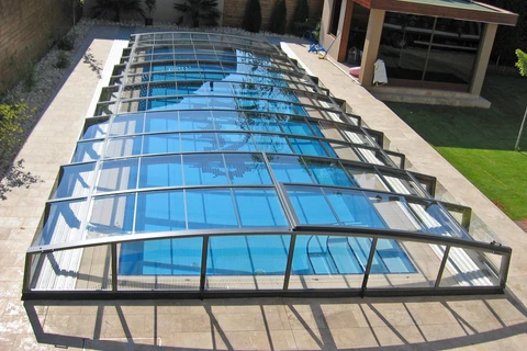 Sistemul cu doua sine face ca acoperirea sa fie stabila, dar mai ales usor de manevrat. Usa laterala nglisanta este pozitionata pe cel mai inalt segment, permitand accesul comod si sigur in piscina, chiar si pentru copii sau persoane in varsta.