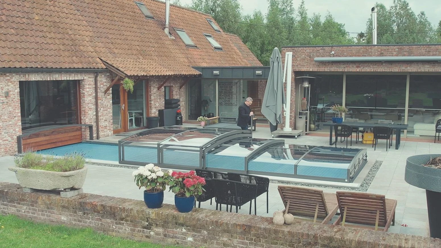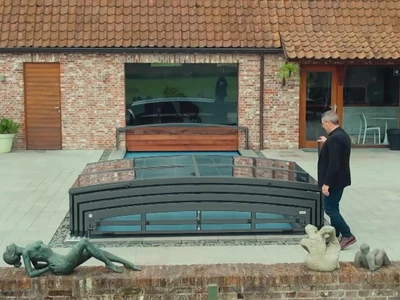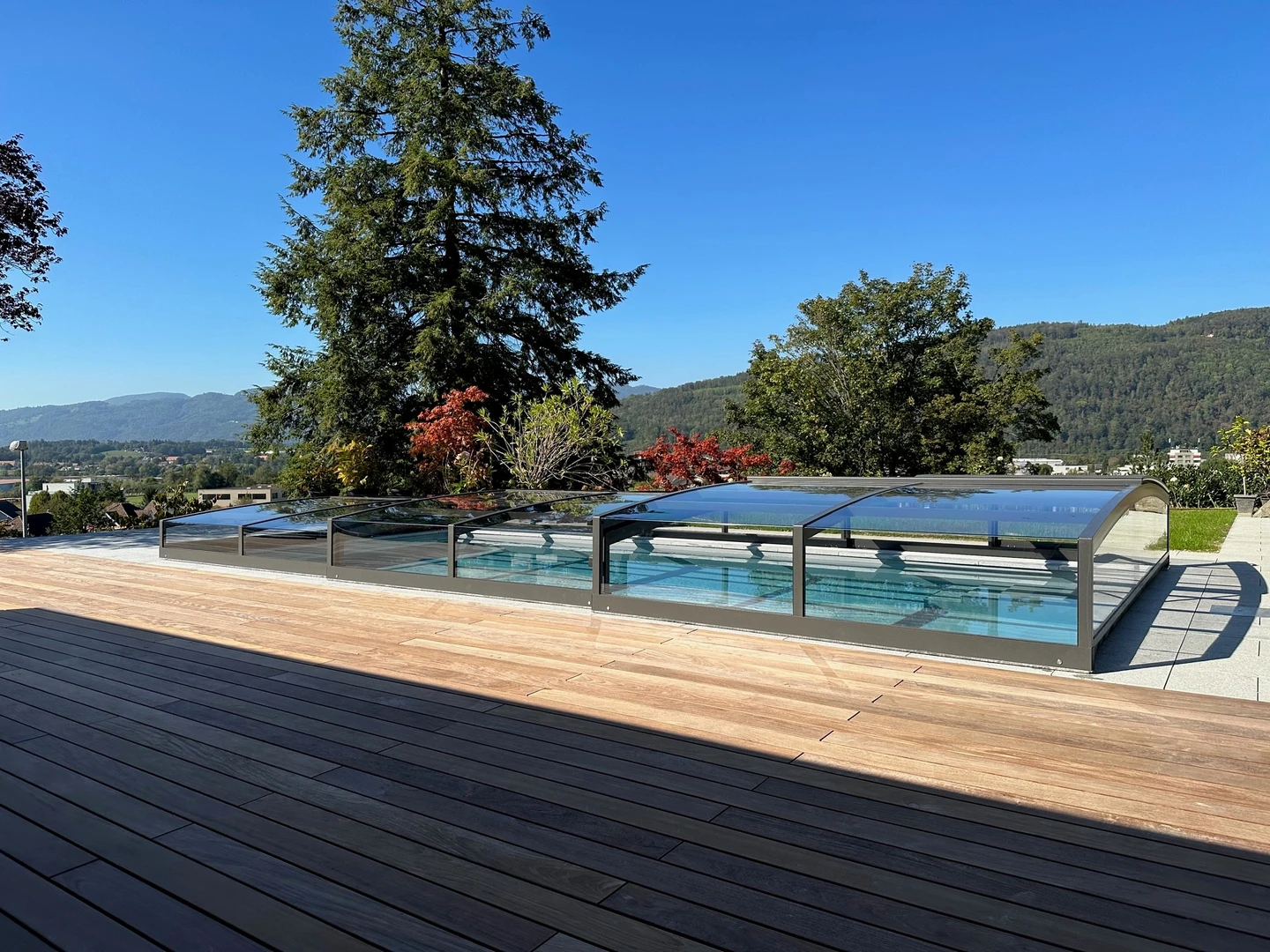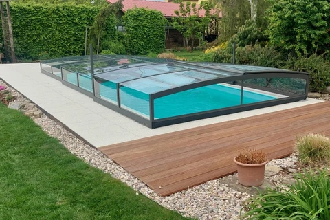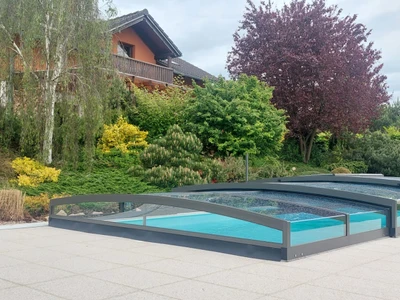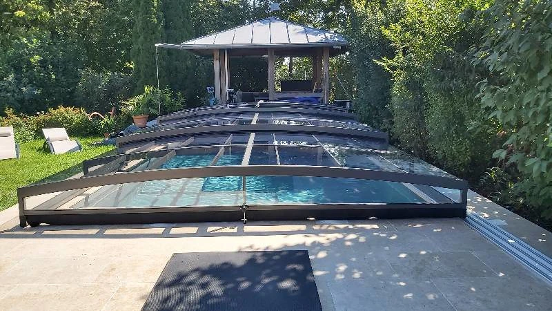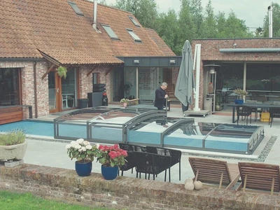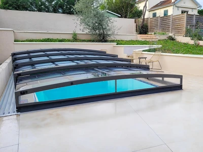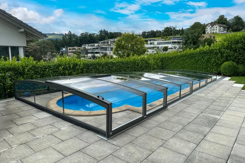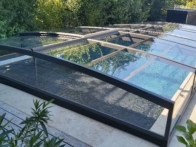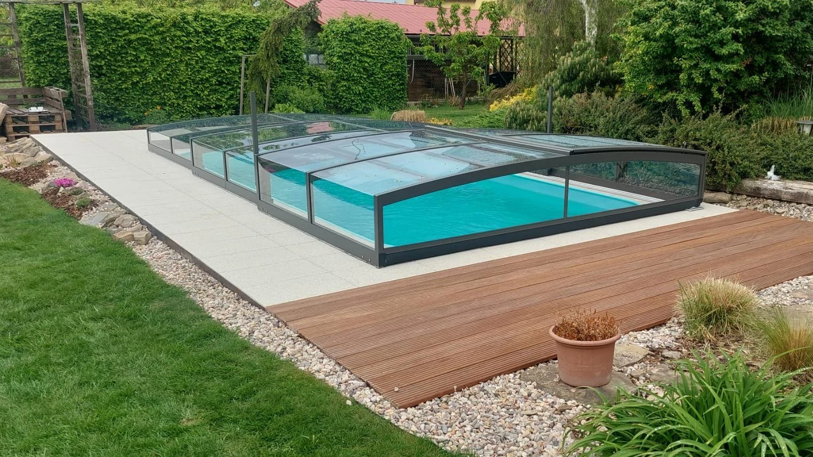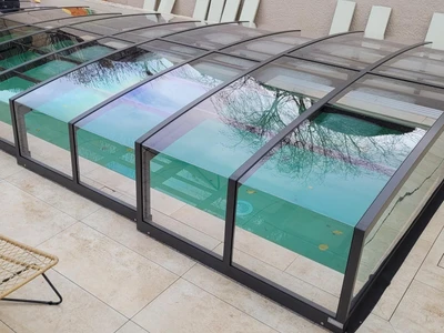 Panourile transparente din policarbonat permit vizibilitatea completa a piscinei chiar si in pozitia inchis, sporind conexiunea vizuala cu suprafata apei si contribuind la experienta estetica. Incuietorile de siguranta previn deschiderea accidentala sau deschiderea brusca cauzata de vant puternic, in lipsa utilizatorului, protejand astfel nu doar piscina, ci si imprejurimile acesteia.