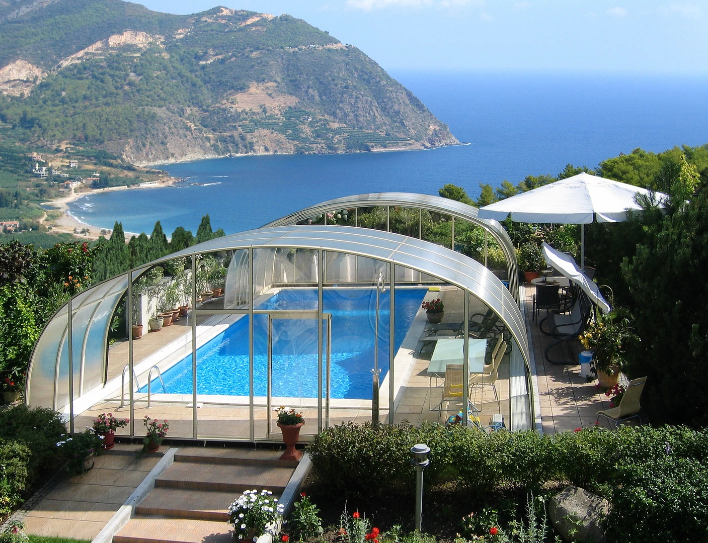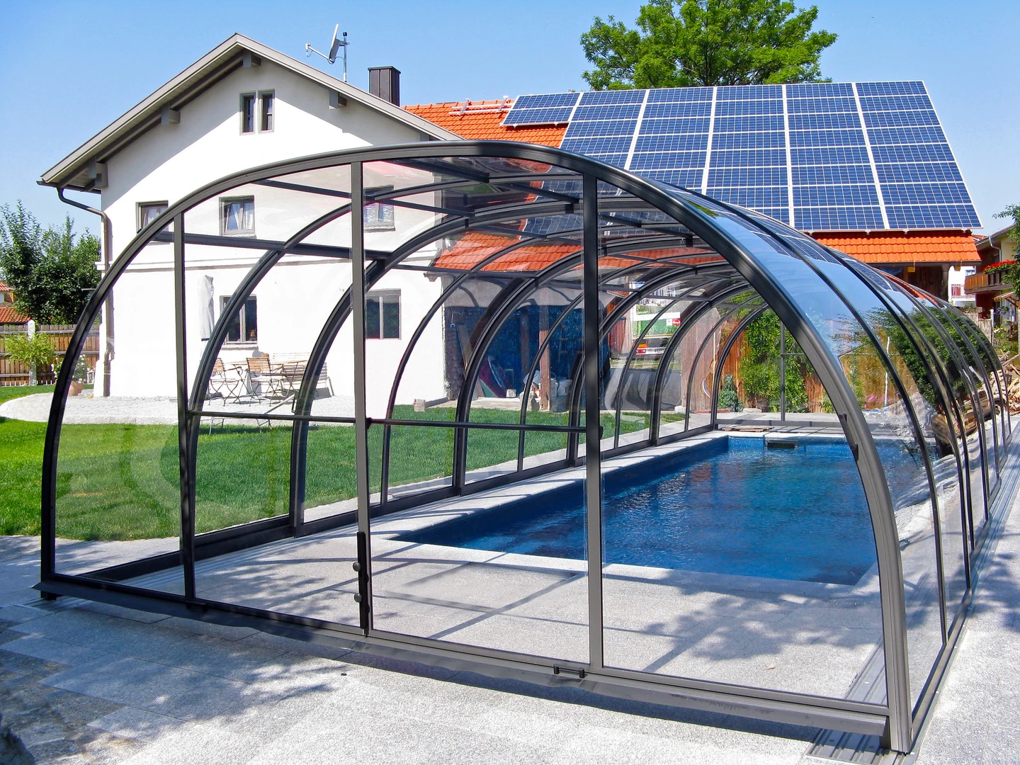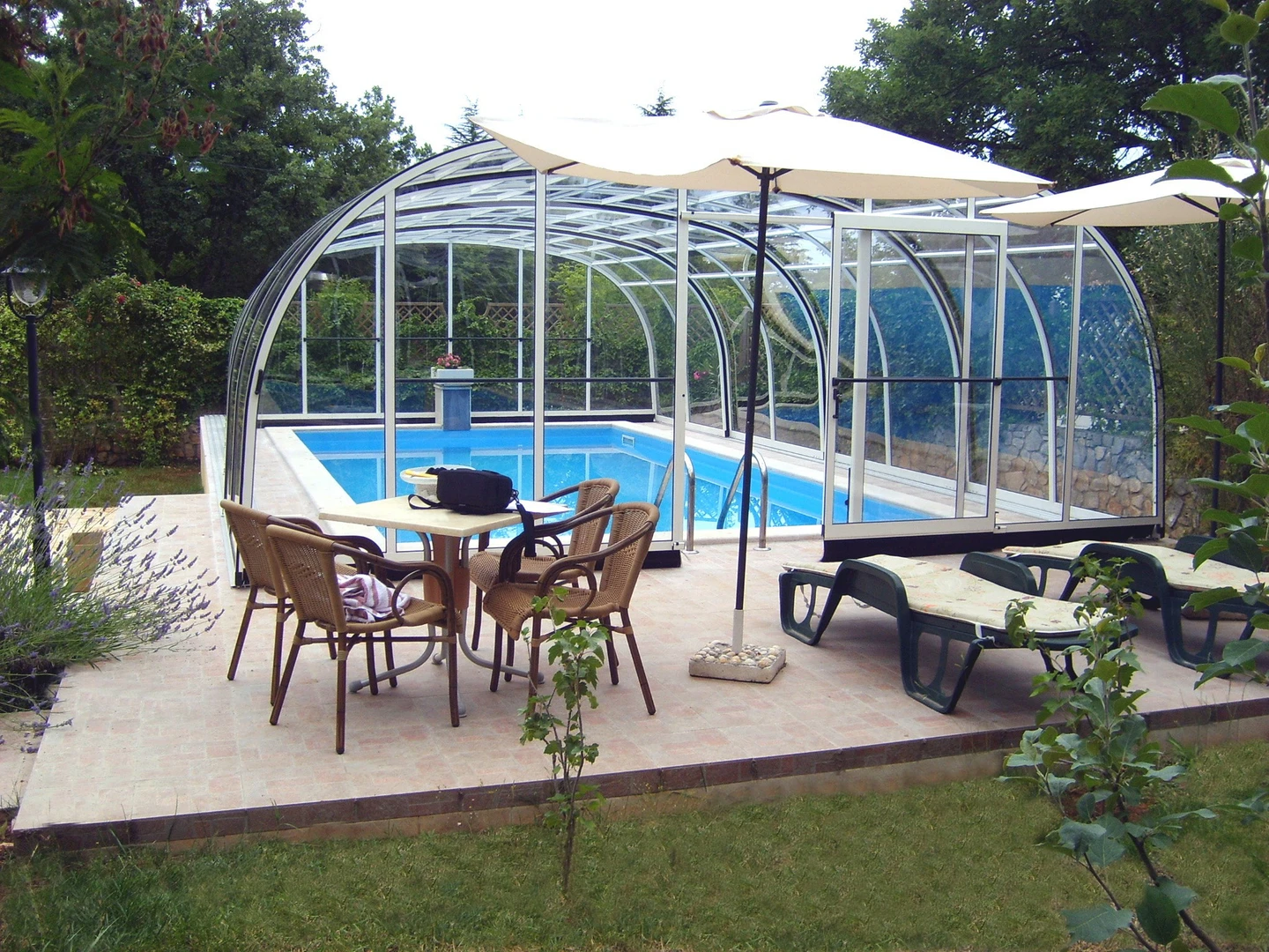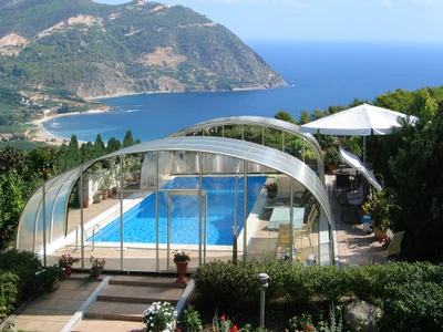 Aceasta acoperire ofera nu doar spatiu generos pentru inot, ci creeaza si o zona confortabila pentru amplasarea mobilierului de exterior, unde, dupa inot, familia sau prietenii se pot relaxa intr-un loc protejat si ferit de vant.