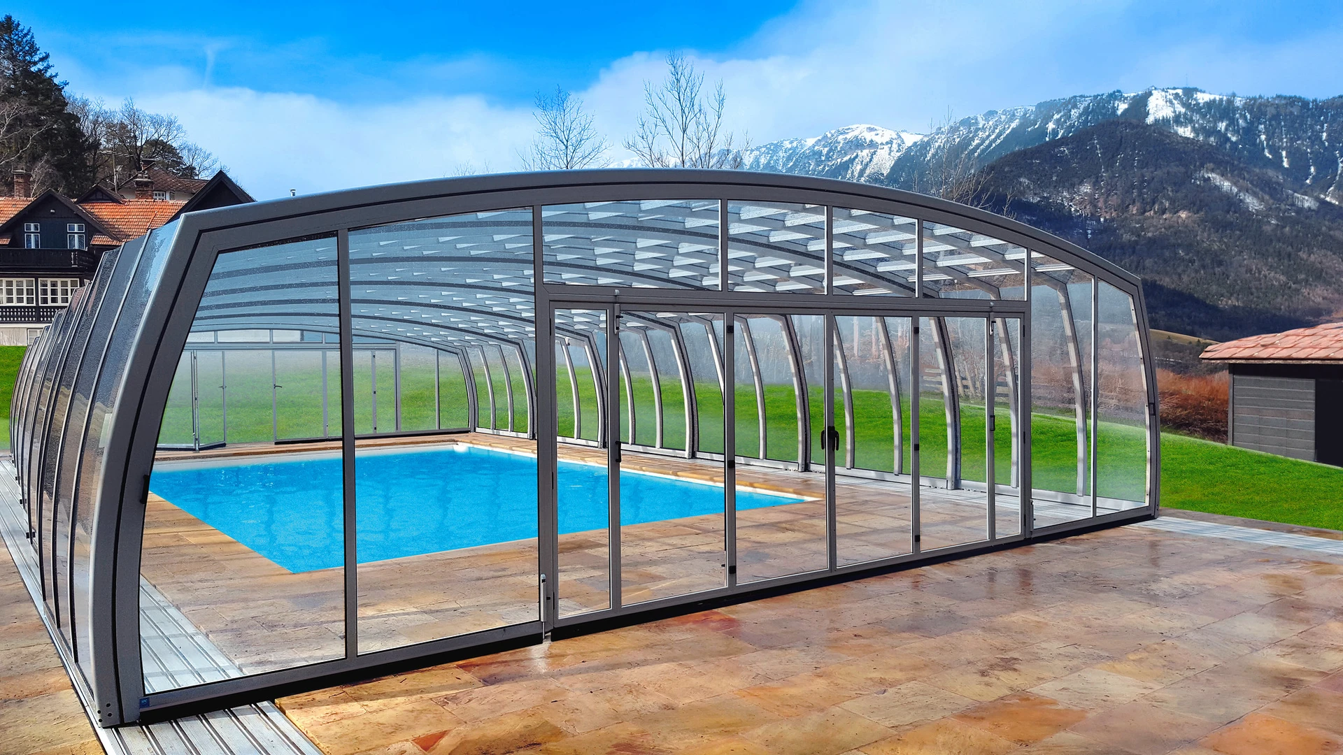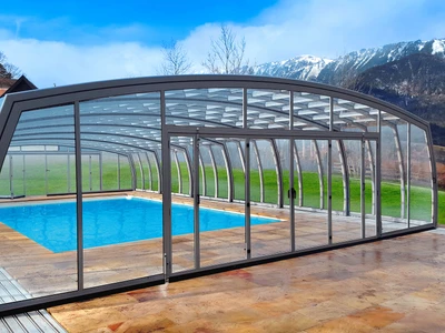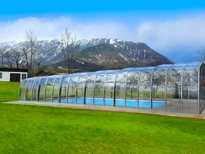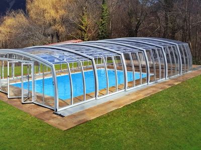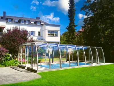 Acoperirea de piscina OMEGA™ se remarca prin designul sau special, oferind o experienta unica celor care cauta o acoperire spatioasa si estetica. Peretii laterali curbati inspre exterior, inspirati de litera greceasca omega, nu doar sporesc vizual senzatia de spatiu, ci fac acoperirea sa para mai joasa, oferind in acelasi timp un spatiu complet accesibil si confortabil in jurul piscinei.