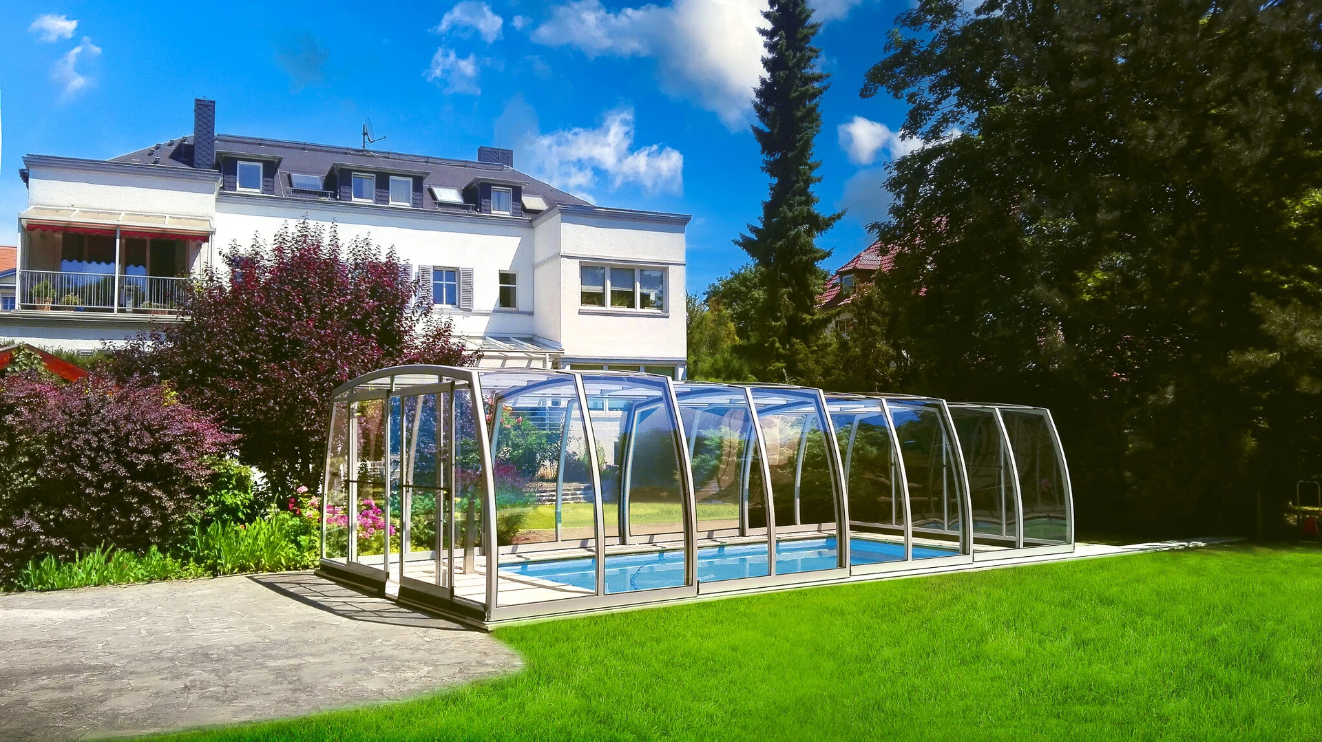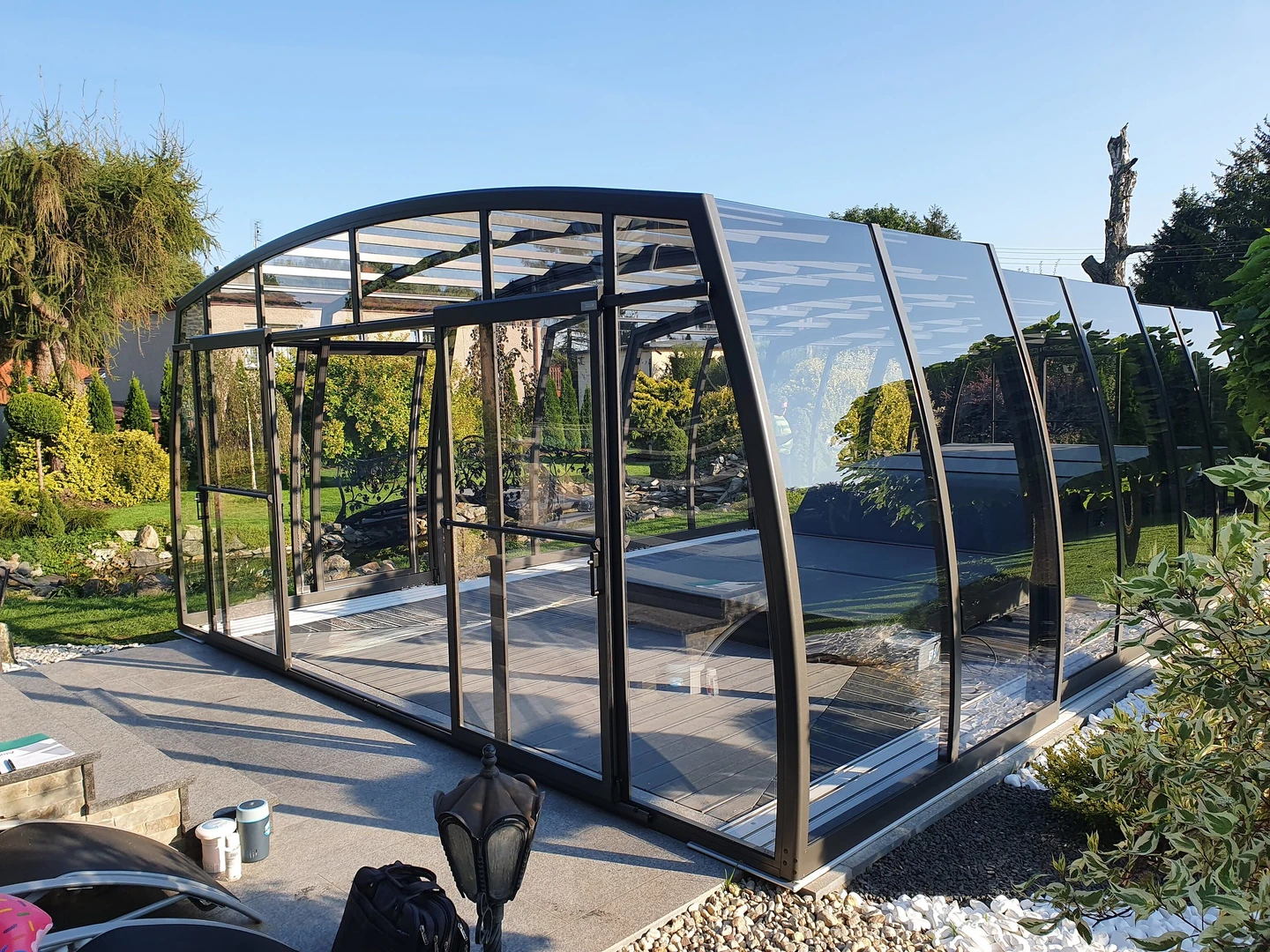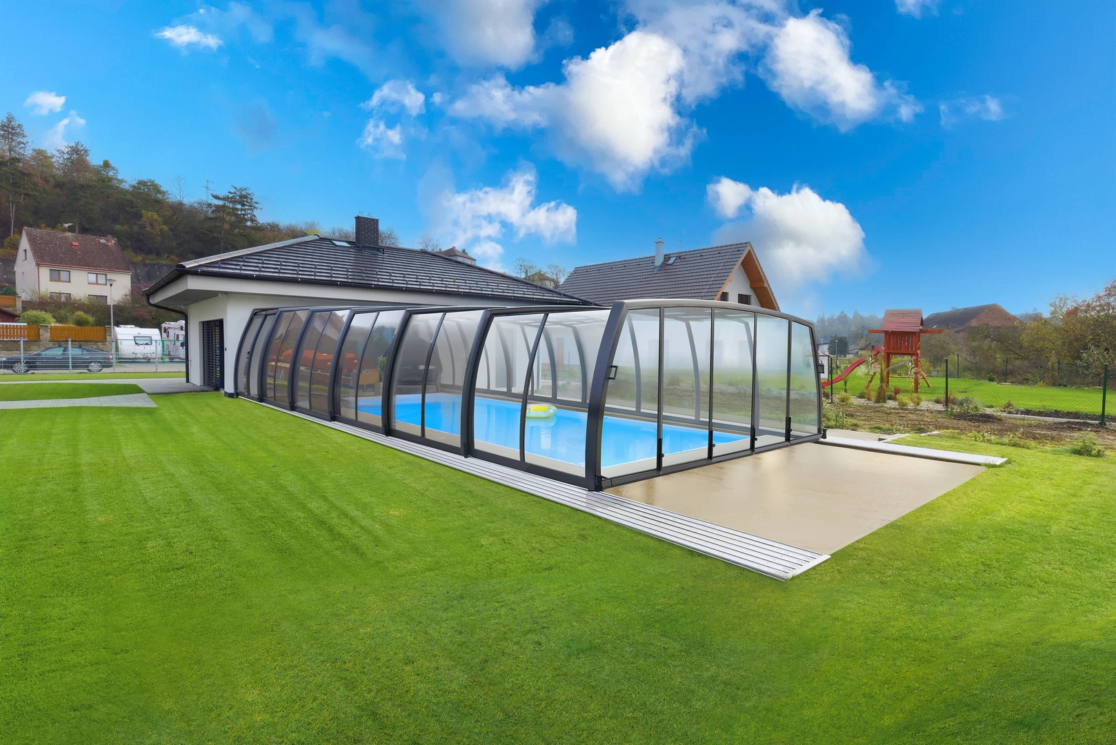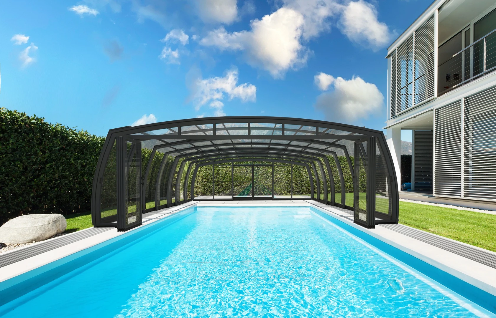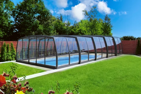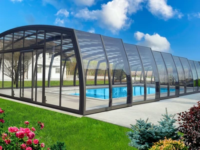 Acoperirea de piscina OMEGA™ este alegerea ideala pentru cei care cauta o solutie estetica si spatioasa, pentru protectia piscinei. Designul modern permite miscare libera in jurul piscinei, facilitand utilizarea si intretinerea. Peretii curbati fac acoperirea sa para mai joasa, pastrand aspectul natural si armonios al gradinii.