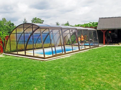 Acoperirea pentru piscina VIVA™, cu inaltime redusa, de la Alukov ofera, prin sistemul sau elegant cu o singura sina, acces fara obstacole la piscina din trei parti. Designul modern nu doar ca ofera protectie eficienta impotriva murdariei, dar ajuta si la incalzirea mai rapida a apei si, pe timpul noptii, mentine temperatura optima a acesteia.