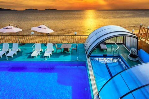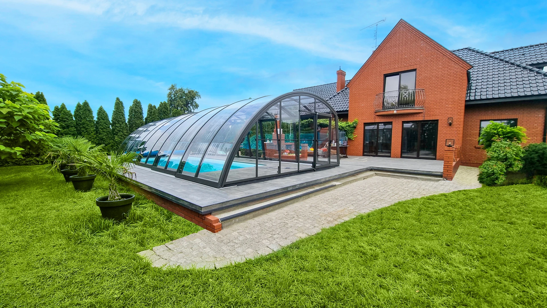 Acoperirea de piscina AZURE™ Angle este modelul cu impactul vizual del mai mic, din gama AZURE, combinand elegant acoperisul curbat cu peretii laterali inclinati. Designul modern permite integrarea armonioasa in orice ambient al gradinii. Panourile din policarbonat compact complet transparent (aspect sticla), durabile si cu protectie UV, asigura o protectie fiabila impotriva factorilor externi.