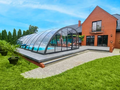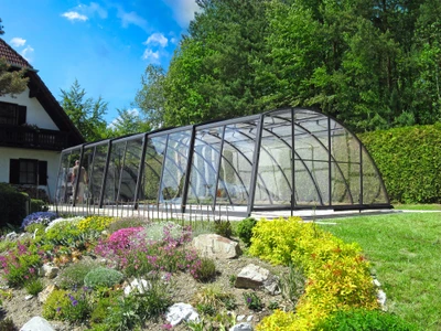 Acoperirea AZURE Flat pentru piscina are o inaltime redusa, iar prin aspectul sau curat si elegant se potriveste perfect stilurilor moderne de gradina. Datorita designuluii cu mai multe raze, se integreaza armonios in mediul inconjurator. Este disponibila cu invelis din policarbonat cu o singura celula si culoarea profilelor argintiu sau antracit, permitand astfel personalizare usoara.