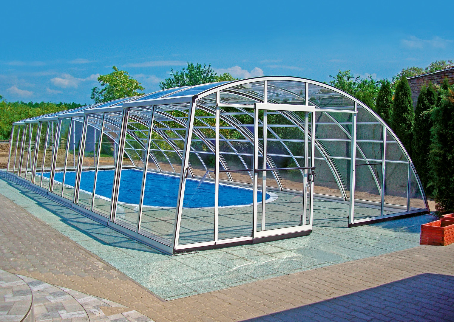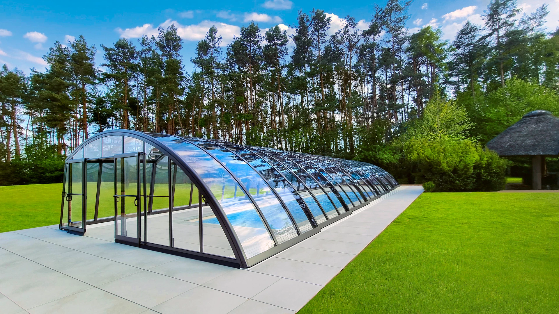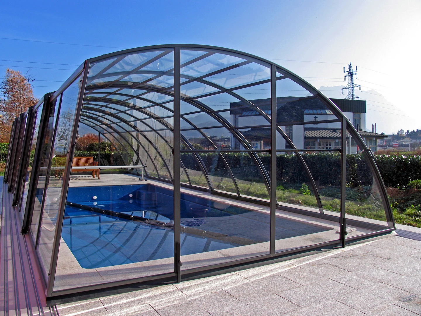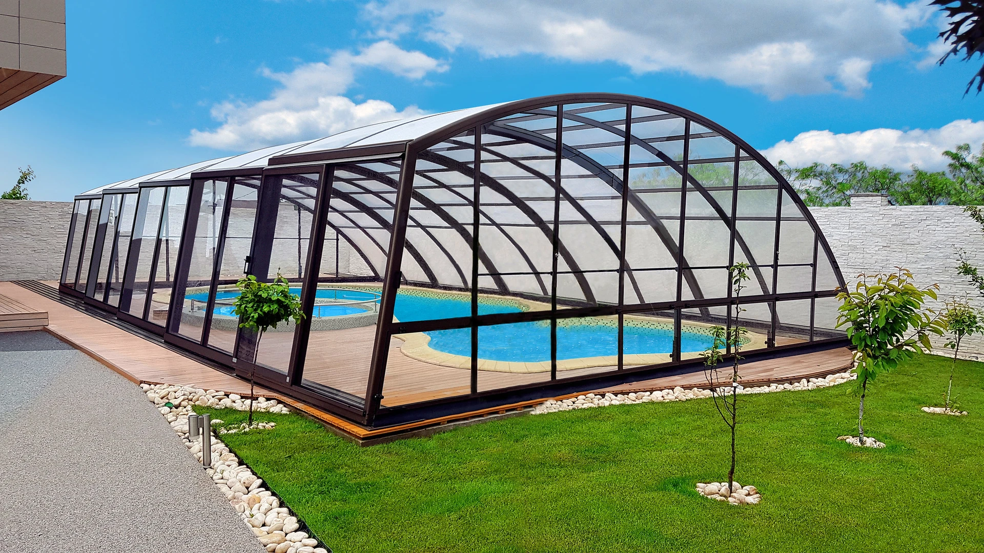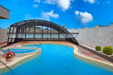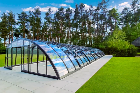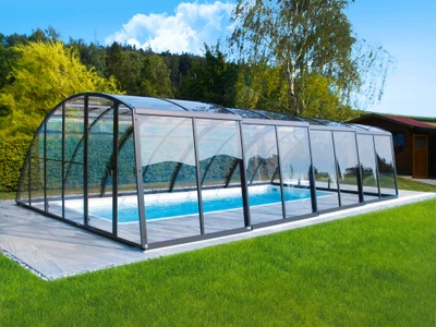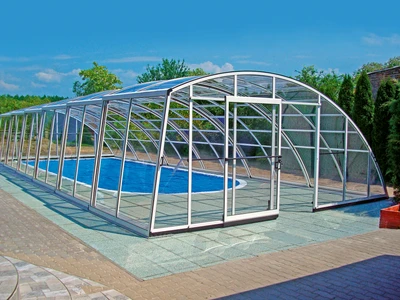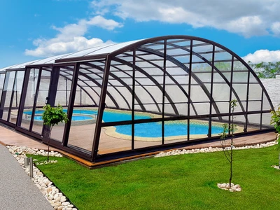 Acoperire pentru piscina AZURE™ presupune o inaltime medie si un design elegant si simplu. Structura este formata dintr-un singur profil din aluminiu curbat, care asigura un aspect modern si durabilitate. Vitrarea este realizata din policarbonat cu o camera de aer, de 8 mm.