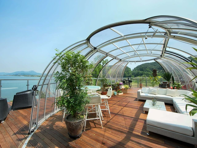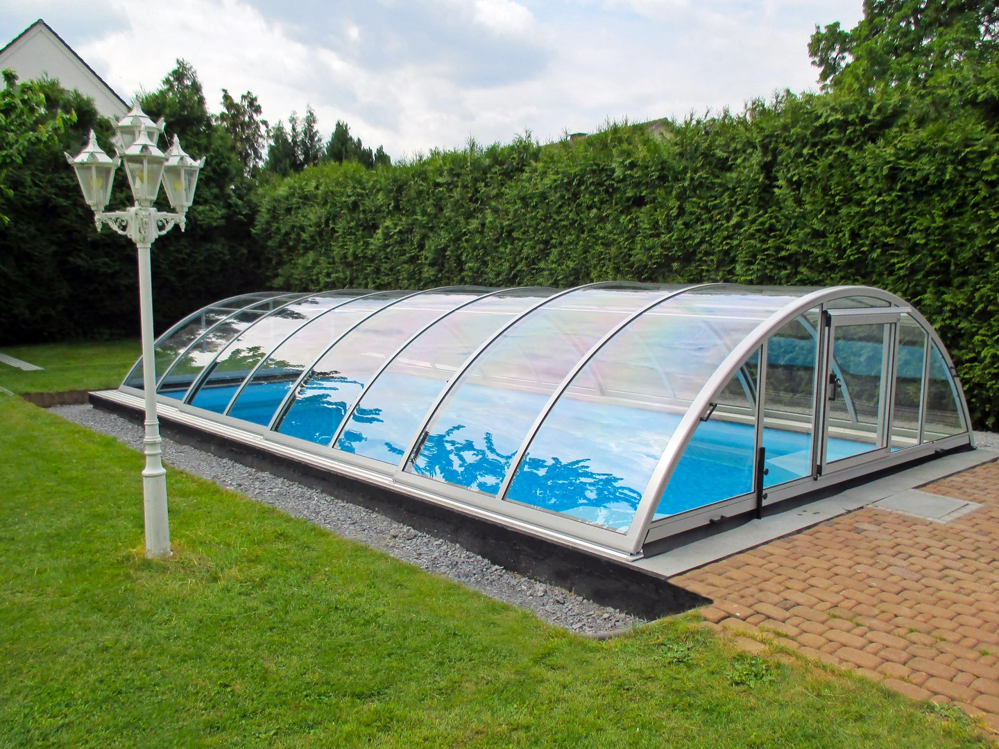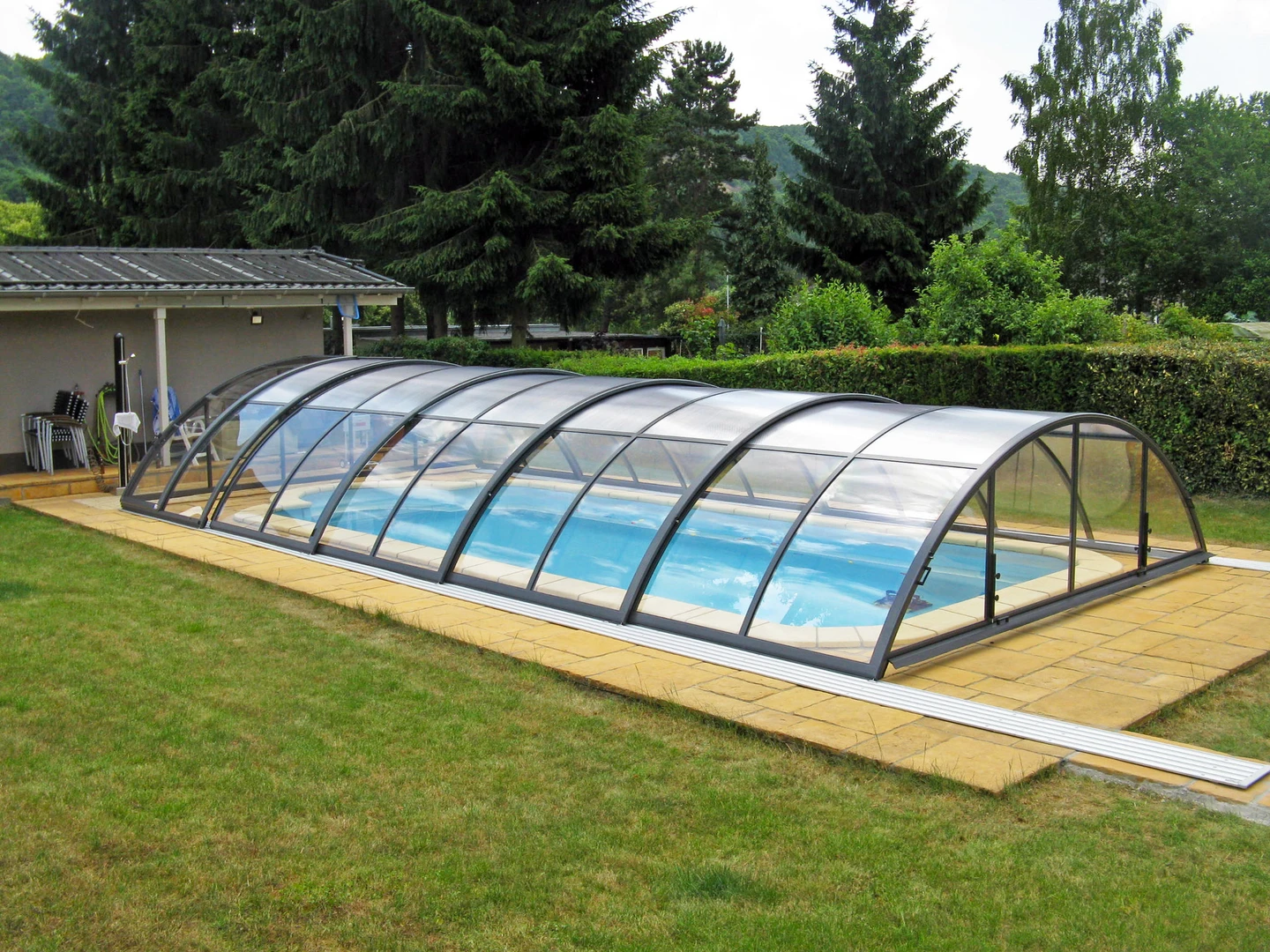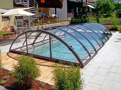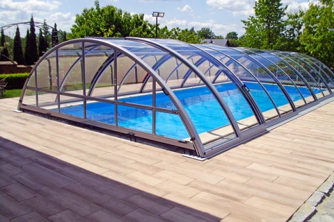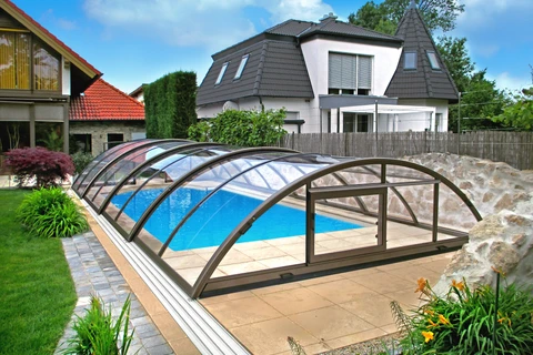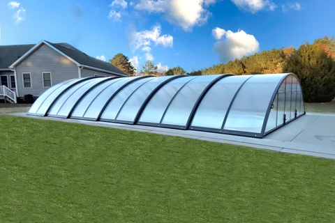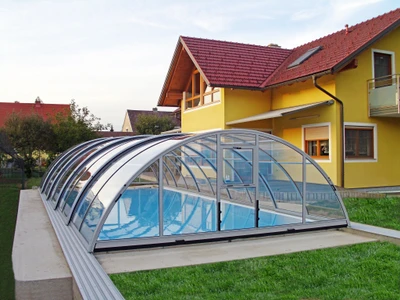 Acoperirea pentru piscina RAVENA™ se remarca prin designul sau modern, combinand elegant peretii verticali cu acoperisul rotunjit, permitand acces liber la piscina din trei parti. Aceasta solutie este ideala pentru locatiile unde piscina este amplasata aproape de cladire sau de o limita a proprietatii.
