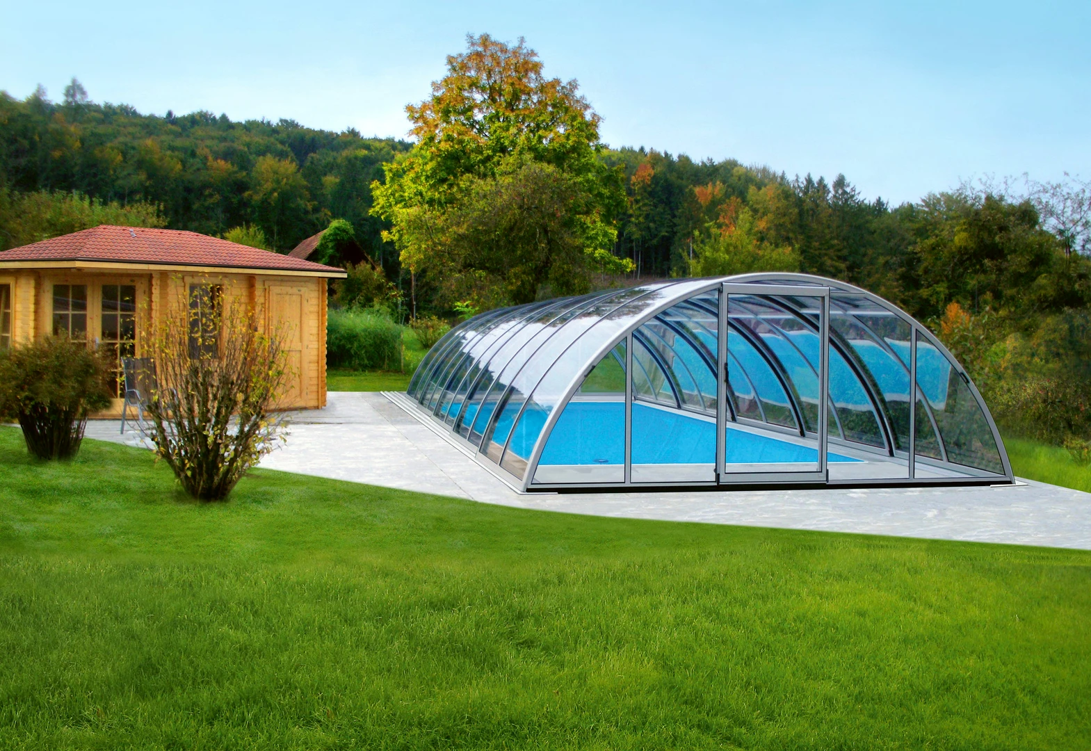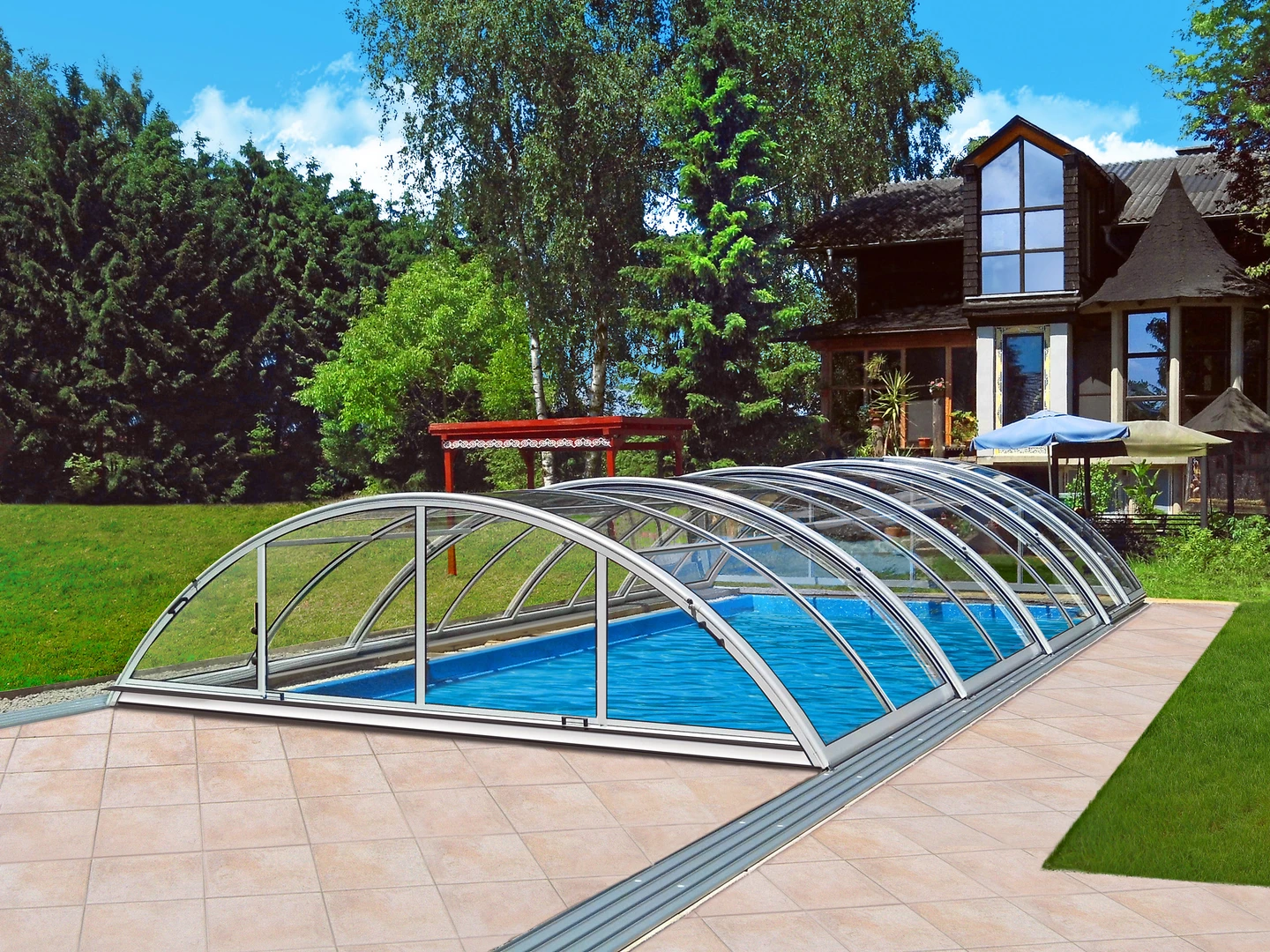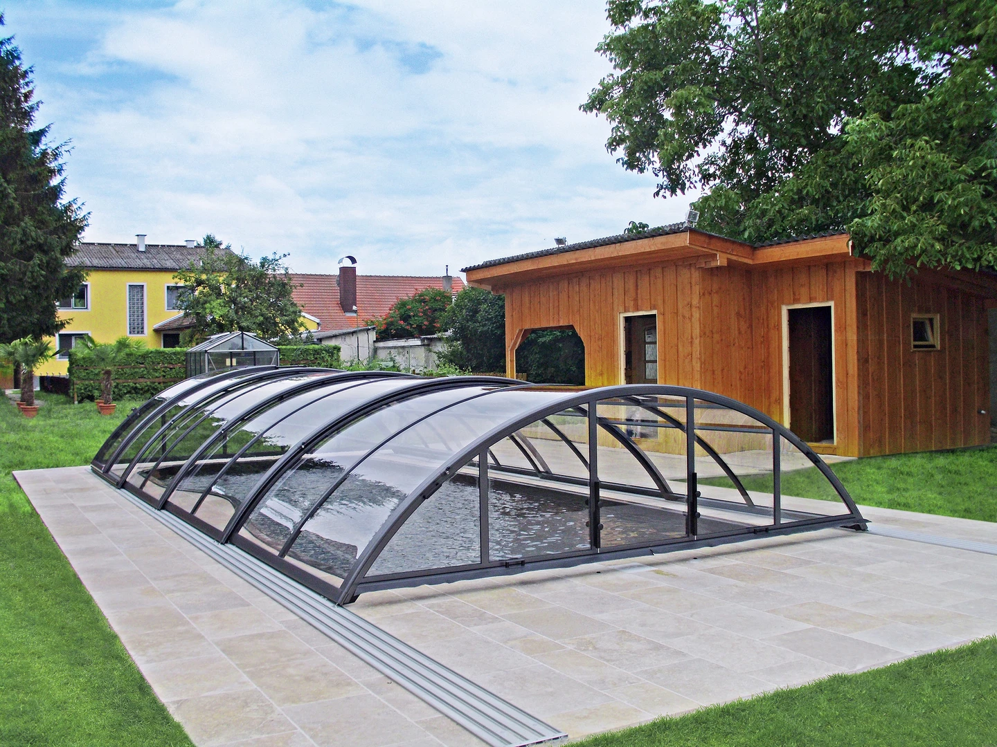 Acoperirea pentru piscina RAVENA™ se remarca prin designul sau modern, combinand elegant peretii verticali cu acoperisul rotunjit, permitand acces liber la piscina din trei parti. Aceasta solutie este ideala pentru locatiile unde piscina este amplasata aproape de cladire sau de o limita a proprietatii.