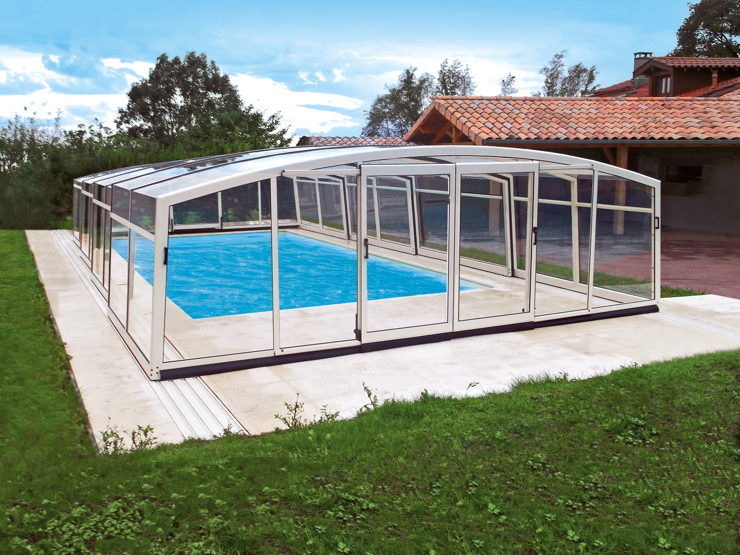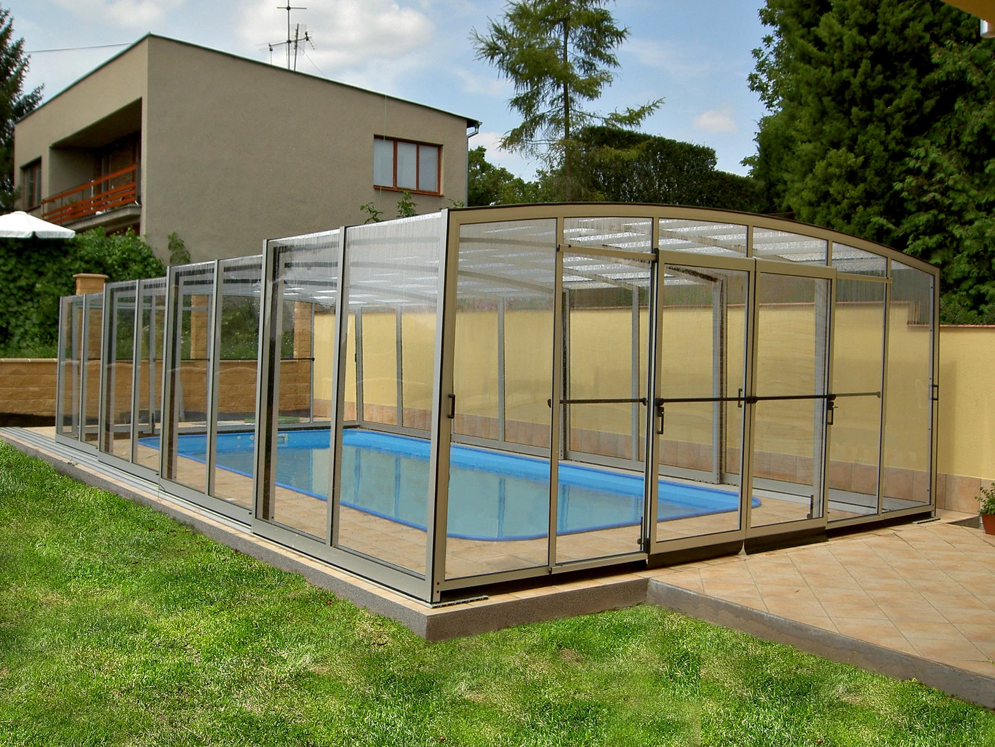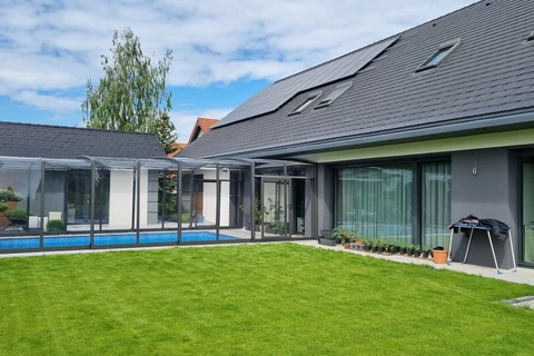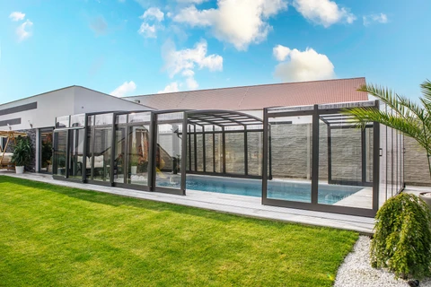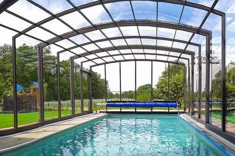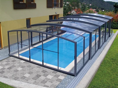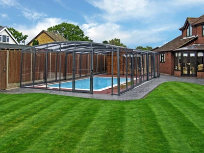 Acoperirea pentru piscina VISION™ ofera inaltime interioara de pana la 180 cm in punctul cel mai putin inalt, permitand miscare confortabila pe intreaga suprafata acoperirii – inclusiv langa pereti. Datorita peretilor laterali verticali, este alegerea ideala pentru locatii unde piscina se afla intre doua cladiri sau ziduri.