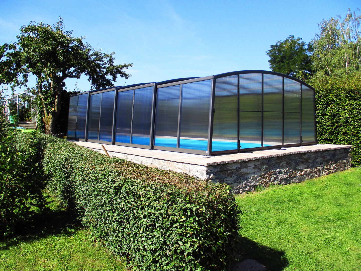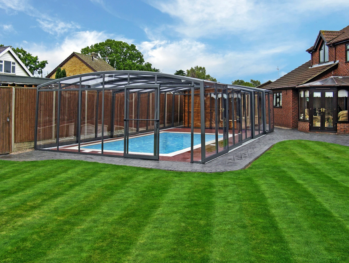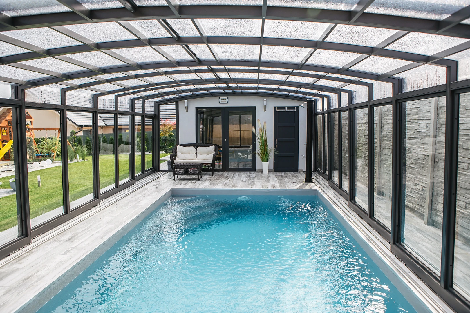Acoperirea pentru piscina VISION™ ofera inaltime interioara de pana la 180 cm in punctul cel mai putin inalt, permitand miscare confortabila pe intreaga suprafata acoperirii – inclusiv langa pereti. Datorita peretilor laterali verticali, este alegerea ideala pentru locatii unde piscina se afla intre doua cladiri sau ziduri.