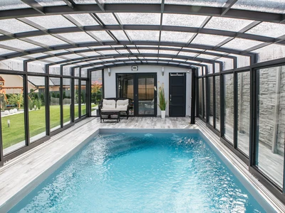 Acoperirea pentru piscina VISION™ cu inaltime mare este alegerea perfecta pentru cei care apreciaza nu doar protectia piscinei, ci si confortul utilizarii si aspectul estetic. Designul modern si curat aminteste de popularul model CORONA™, oferind totodata un spatiu interior mai generos – cu inaltime interioara de pana la 180 cm – permitand miscare si stationare confortabila sub acoperire, inclusiv in picioare.