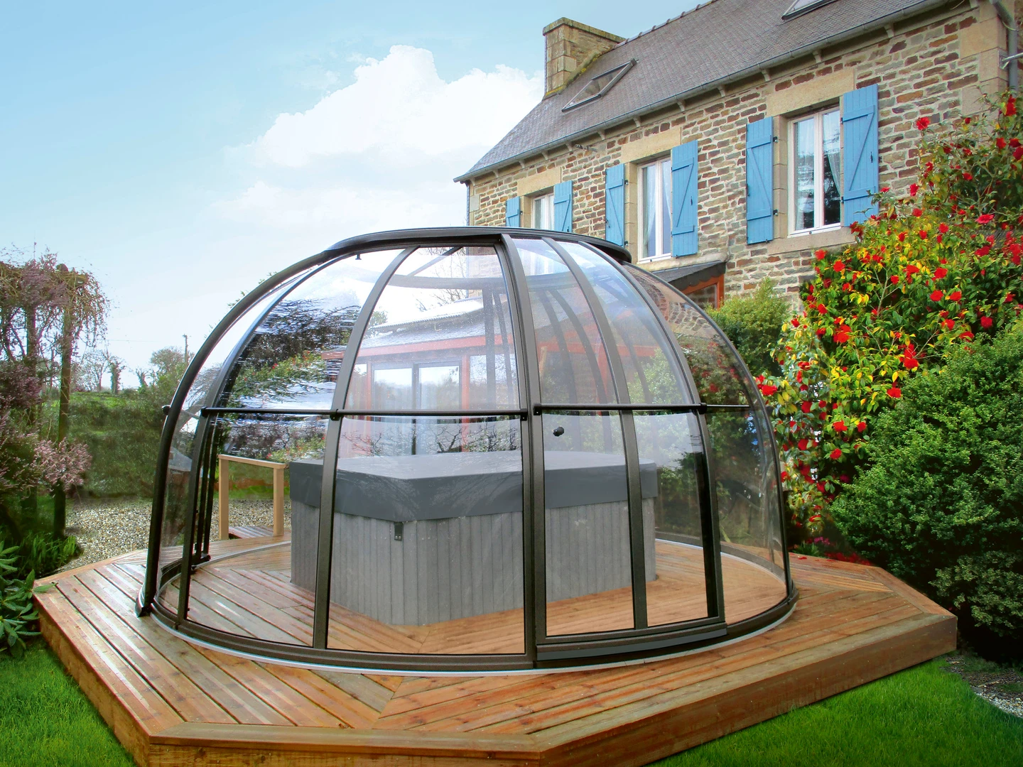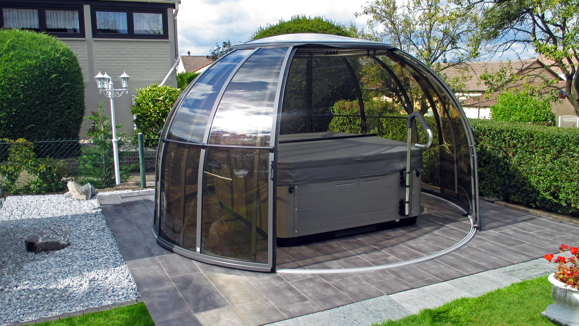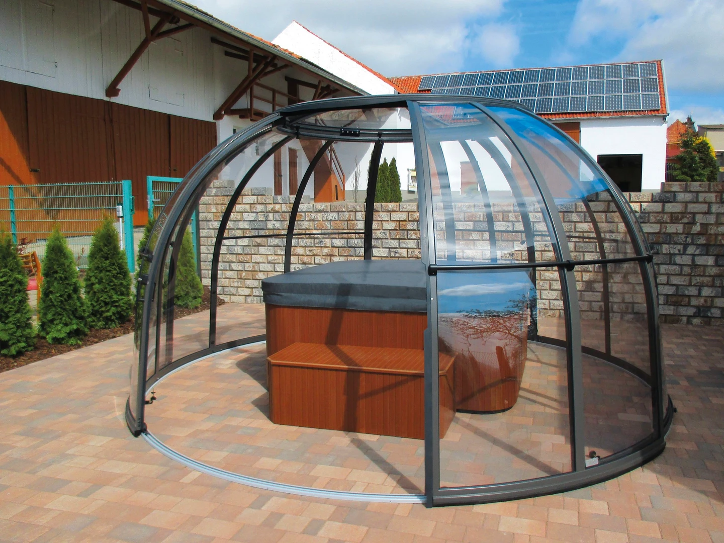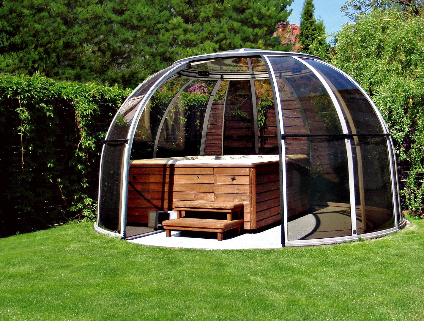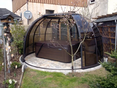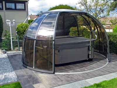 SPA DOME ORLANDO® este conceput pentru cei care doresc sa foloseasca spa-ul indiferent de conditiile meteorologice, pe tot parcursul anului. Aceasta cupola speciala este formata din elemente laterale, segmente cu usi si acoperis, toate montate pe o sina circulara. Datorita sinei, cupola se poate roti usor in ambele directii, permitand optimizarea spatiului din jurul spa-ului – puteti deschide sau inchide dupa necesitate.