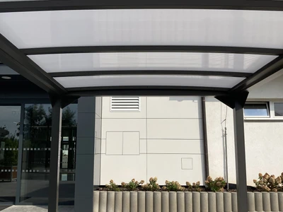 Acoperisul din policarbonat ofera protectie fiabila impotriva ploii, radiatiilor UV, permitand in acelasi timp patrunderea unei cantitati generoase de lumina naturala. Structura nu necesita intretinere si asortateaza cu arhitectura locuintei. Designul simplu permite integrarea usoara in orice mediu, de la gradini urbane la constructii rurale.