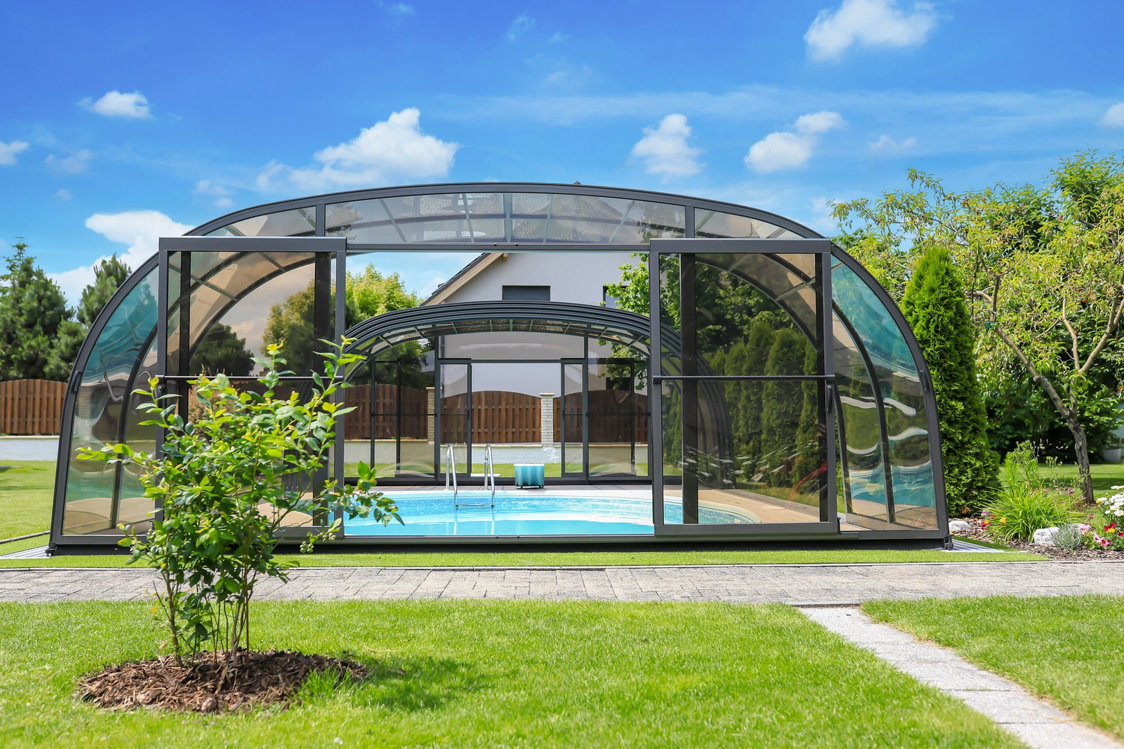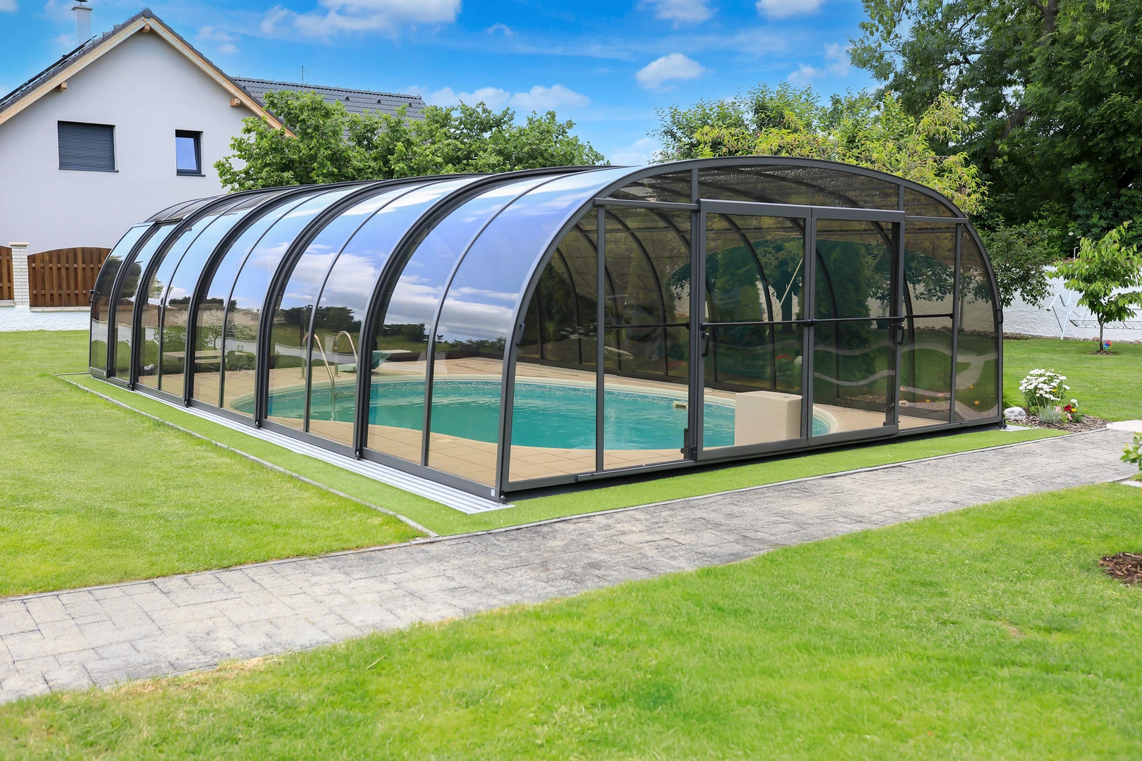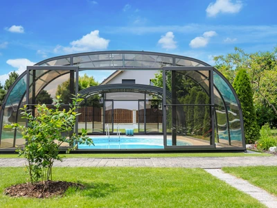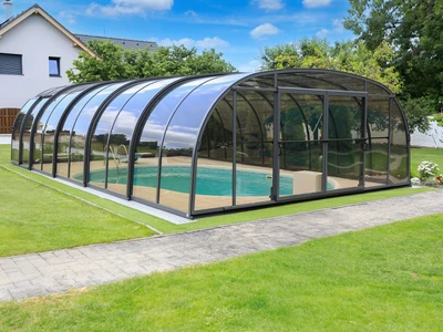 Acoperirea pentru piscina LAGUNA NEO™ de la Alukov imbina designul elegant cu functionalitatea practica. Structura moderna in culoare antracit si panourile din policarbonat fumuriu se integreaza armonios in orice ambient de gradina, oferind in acelasi timp protectie impotriva vremii nefavorabile. Sistemul EASY UP asigura o manevrare usoara fara a fi necesara aplecarea, iar sistemul AIR FRESH permite o ventilatie optima. Aceasta acoperire prelungeste sezonul de inot si sporeste confortul general al utilizarii piscinei.