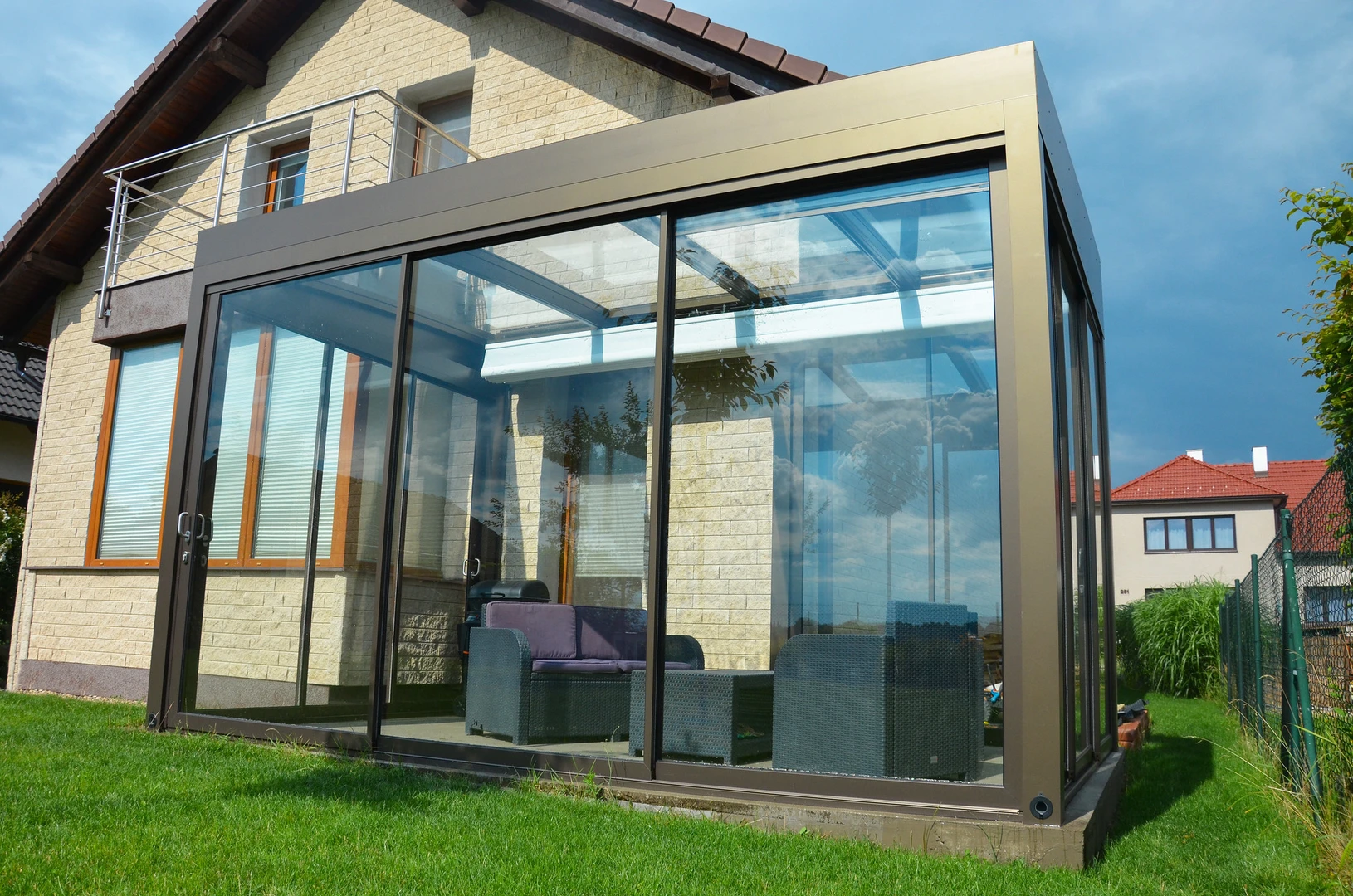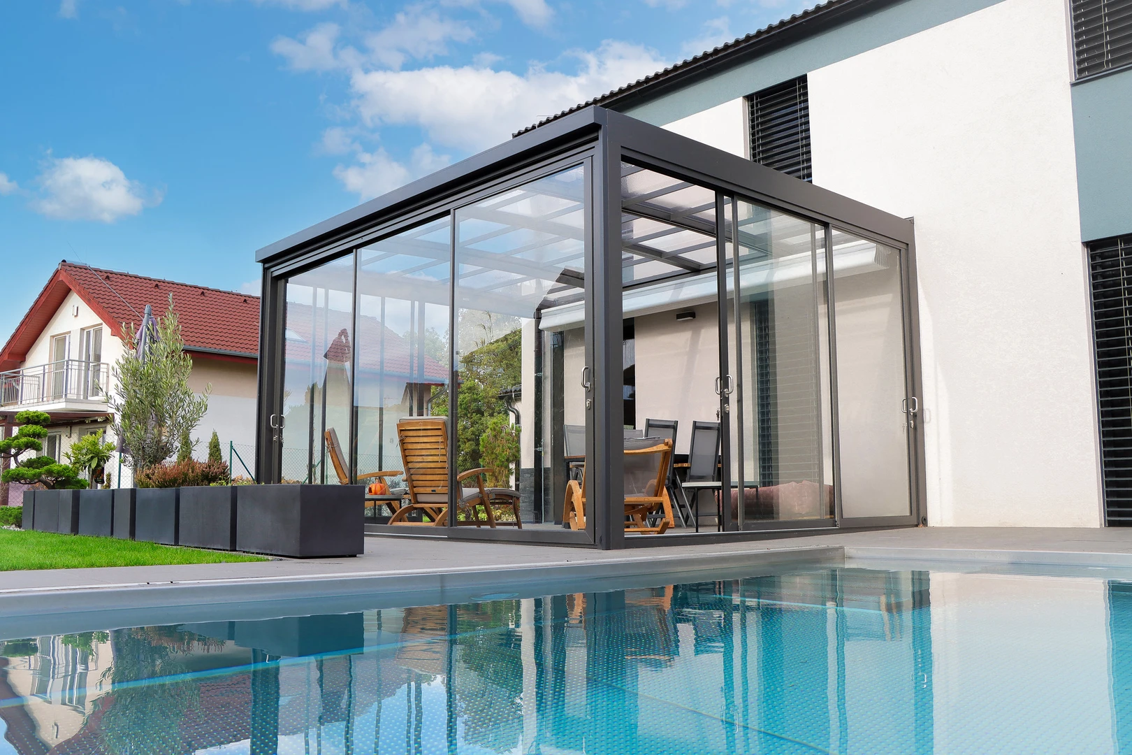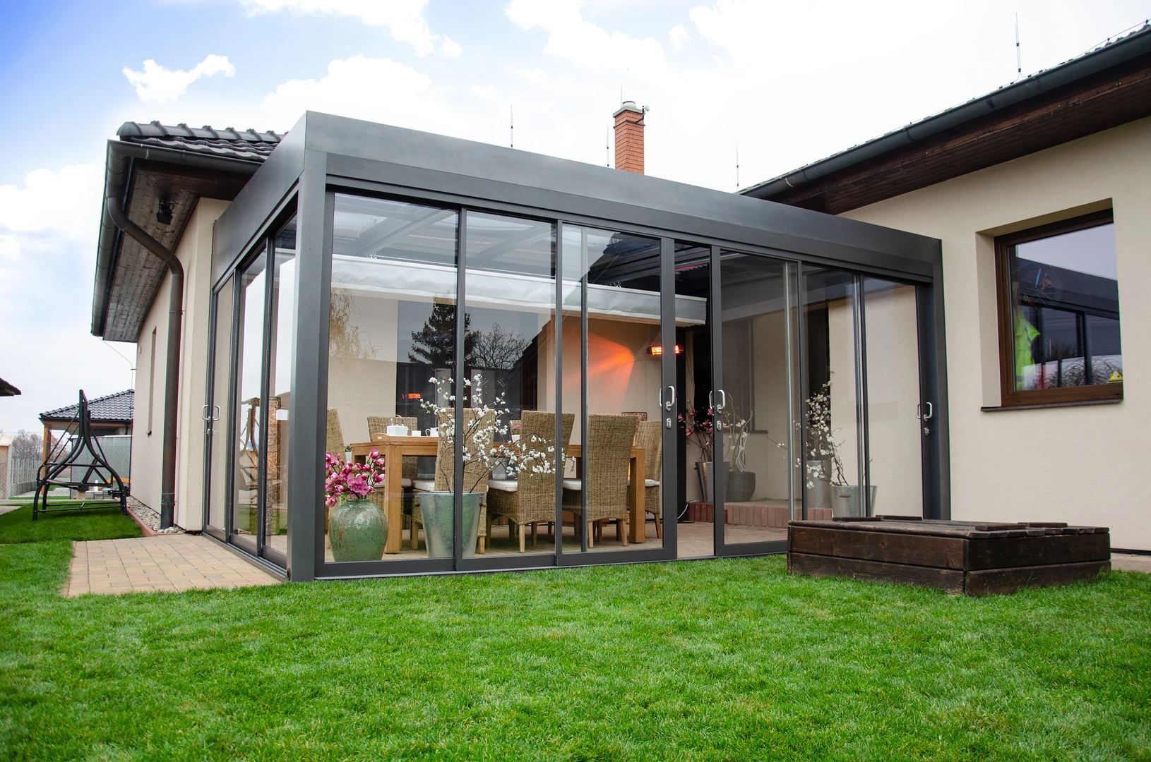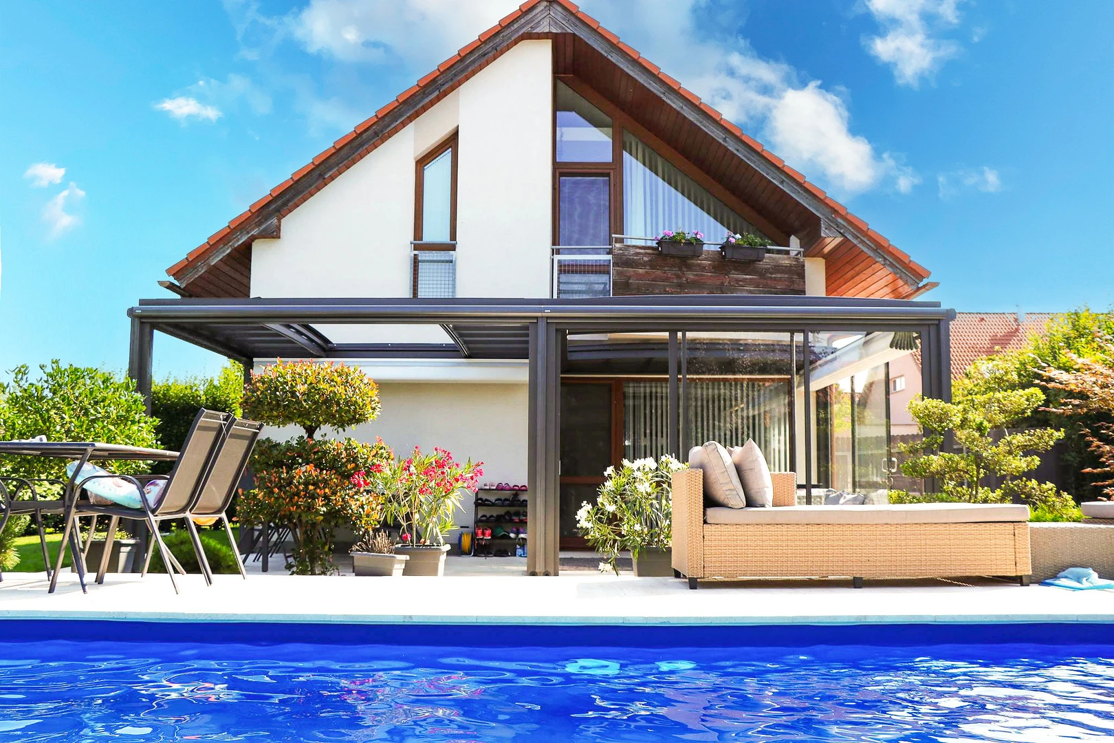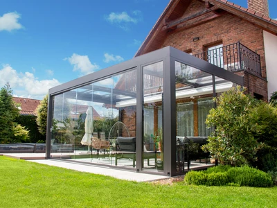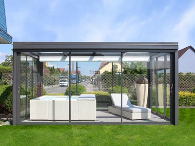 CORSO Ultima – acoperire moderna pentru terasa, cu linii arhitecturale curate, acoperis plan si suprafete vitrate mari. Creeaza spatii luminoase si aerisite, care satisfac chiar si cele mai exigente cerinte.