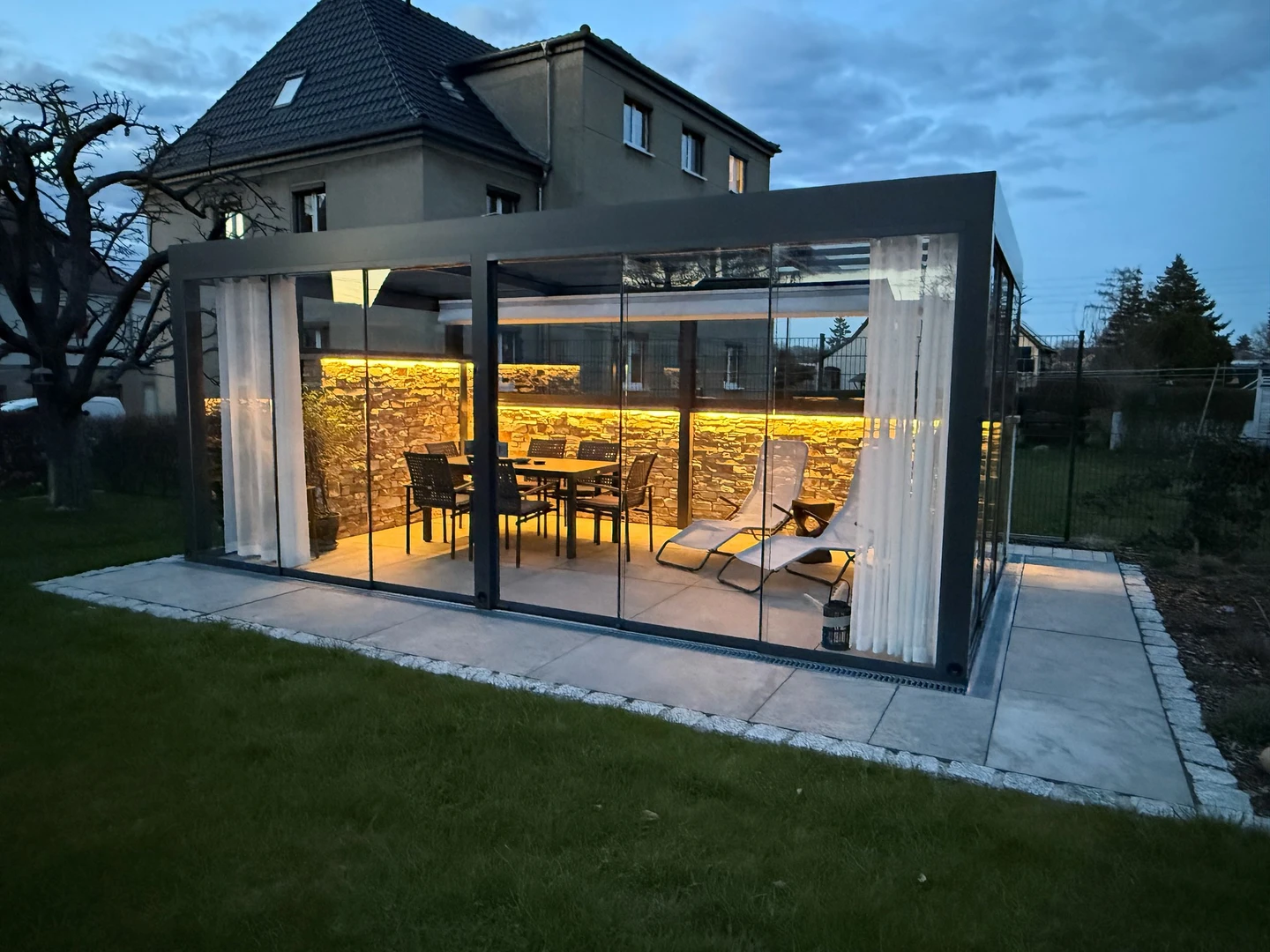 Acoperirea de terasa Alukov CORSO Premium este realizata cu structura din aluminiu, sticla securizata CONNEX 33.1 pe peretii verticlai si policarbonat compact complet transparent pe acoperis. Designul elegant si panorama impresionanta ofera un spatiu confortabil si confortabil, pe tot parcursul anului – usor de utilizat, dar cu aspect luxos.