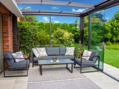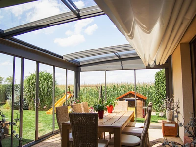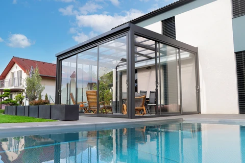 Acoperirea de terasa CORSO Solid este un sistem mobil, cu structura din aluminiu si panouri durabile din policarbonat compact – solutia ideala pentru utilizarea terasei pe tot parcursul anului.