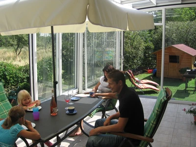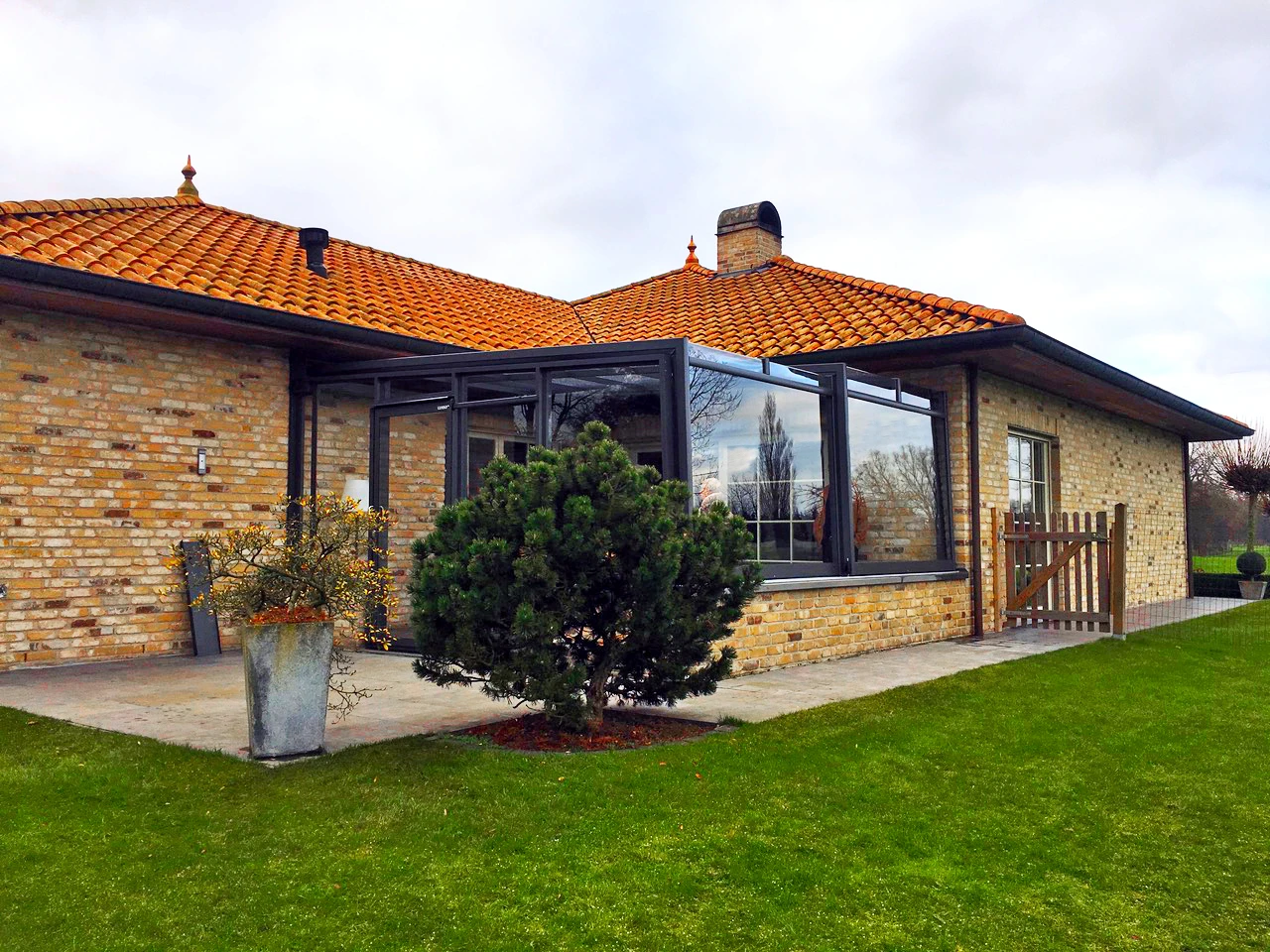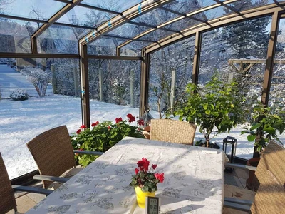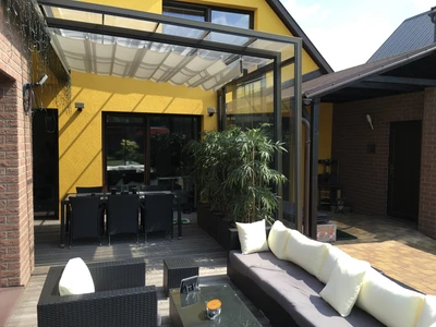 Acoperirea de terasa Alukov CORSO Premium este realizata cu structura din aluminiu, sticla securizata CONNEX 33.1 pe peretii verticlai si policarbonat compact complet transparent pe acoperis. Designul elegant si panorama impresionanta ofera un spatiu confortabil si confortabil, pe tot parcursul anului – usor de utilizat, dar cu aspect luxos.