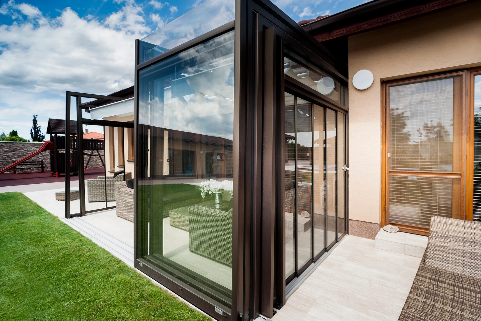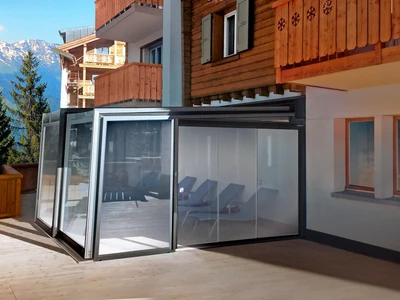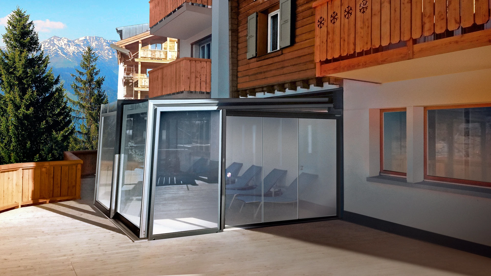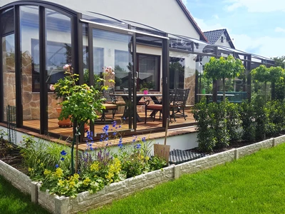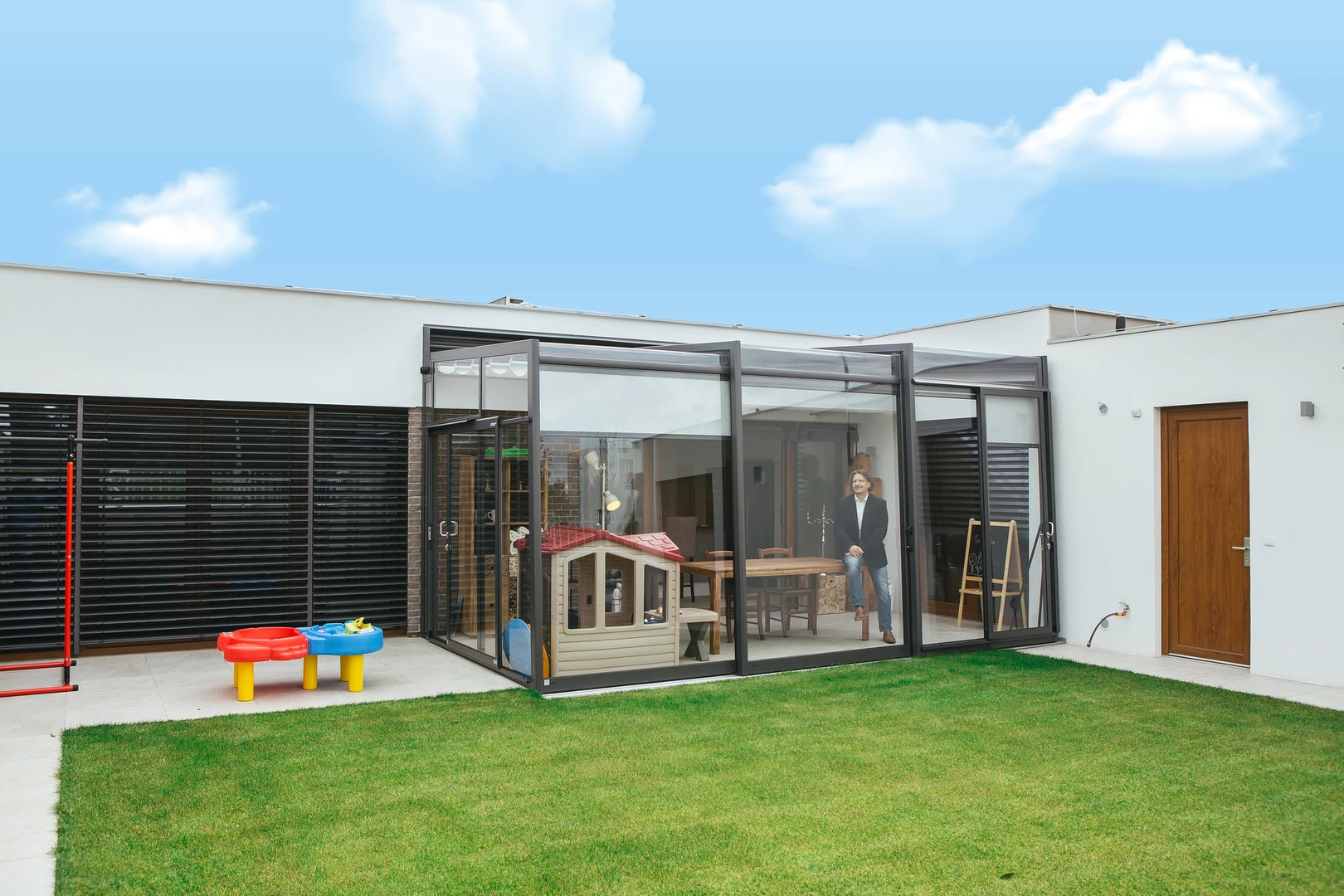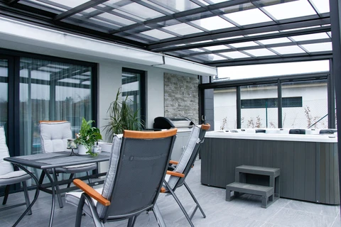 Acoperirea de terasa CORSO Solid este un sistem mobil, cu structura din aluminiu si panouri durabile din policarbonat compact – solutia ideala pentru utilizarea terasei pe tot parcursul anului.