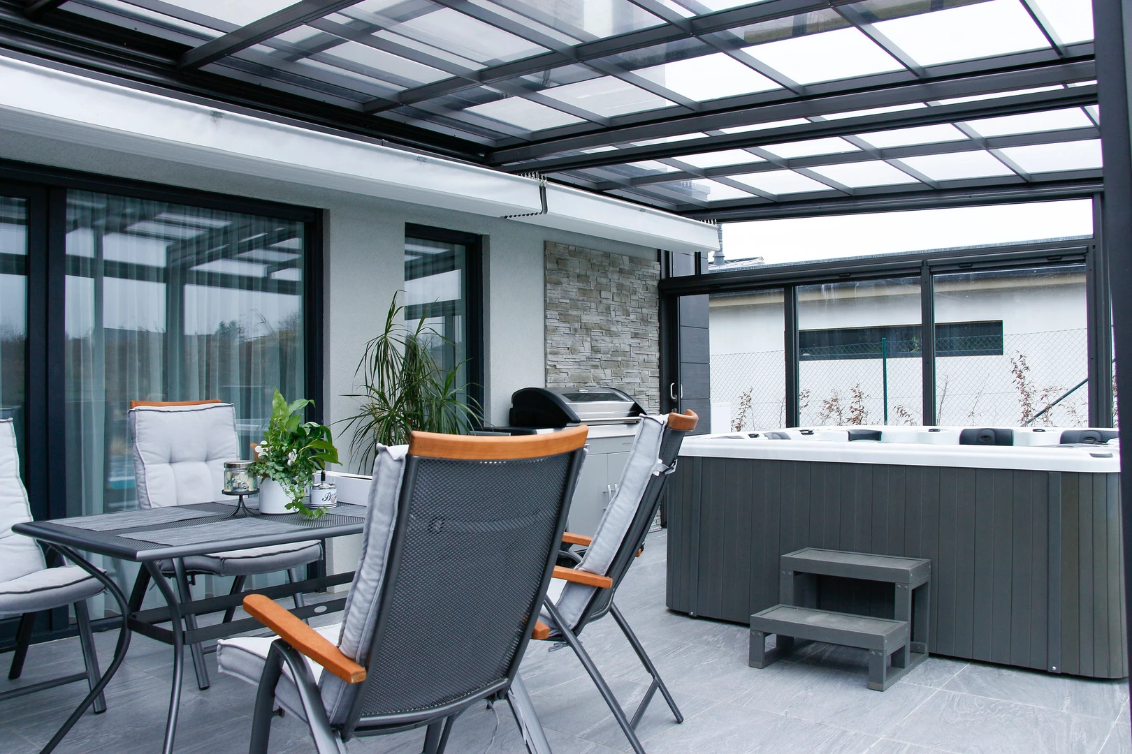 Alukov Pergola SPA – Aceasta pergola multifunctionala, de categorie premium, dispune de acoperis transparent si rabatabil, sistem de umbrire integrat si telecomanda pentru actionare confortabila. Este alegerea ideala pentru utilizarea terasei sau zonei de relaxare, pe tot parcursul anului, oferind confort maxim, protectie si aspect elegant.