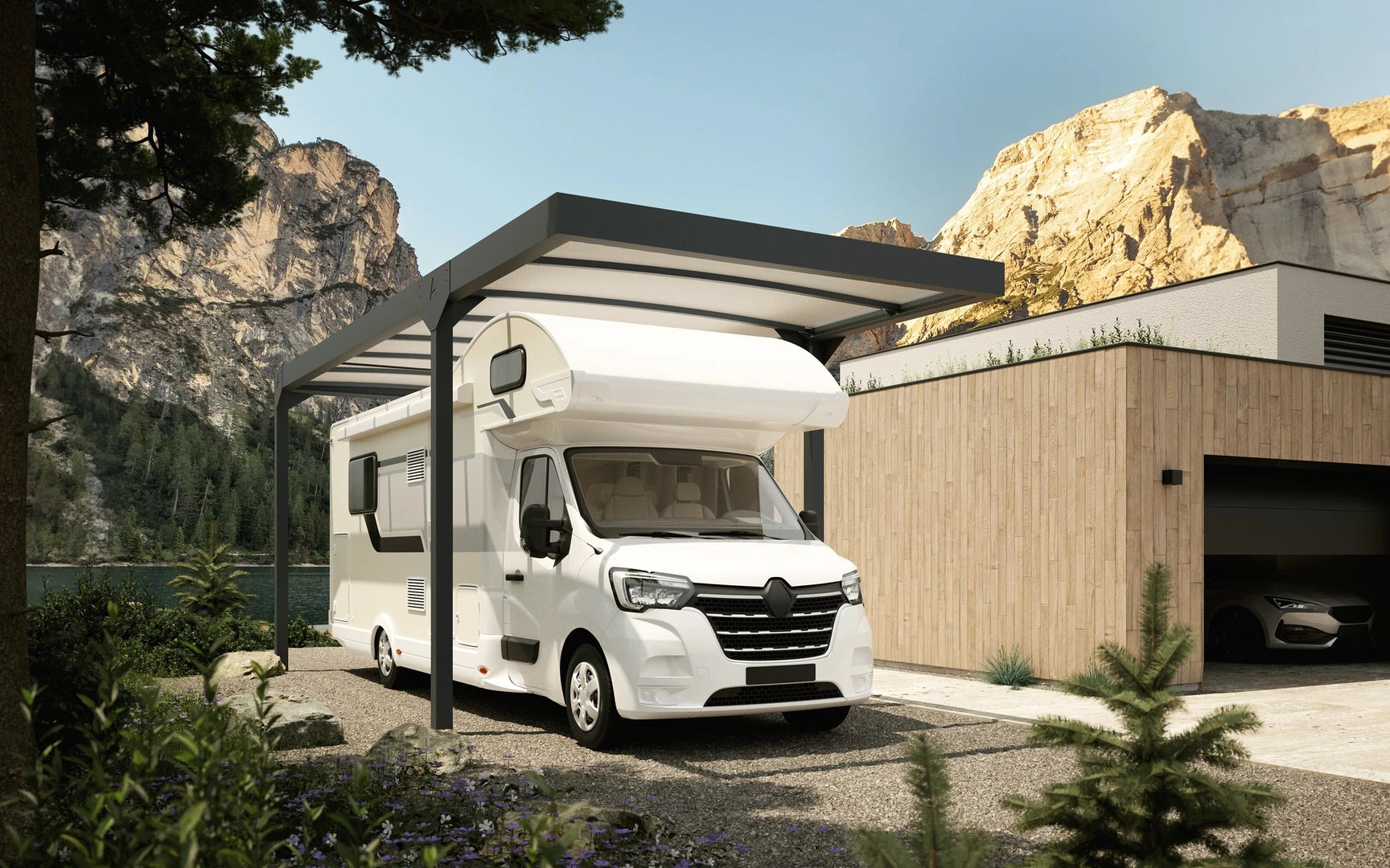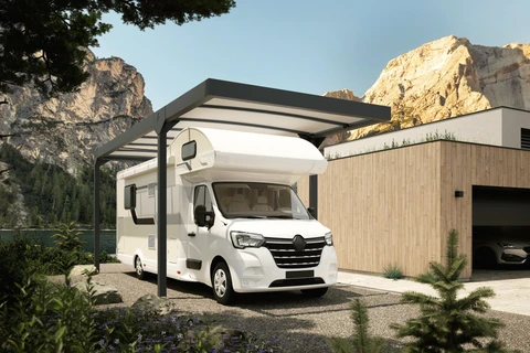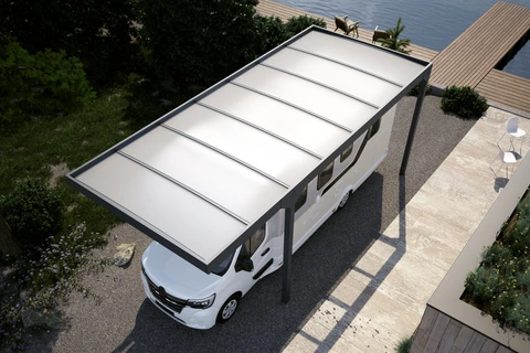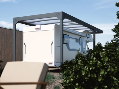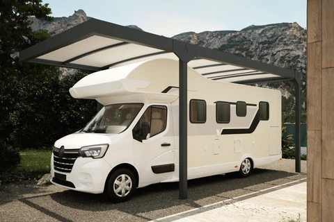 Carport Camper Solar este o acoperire auto inovatoare cu panouri solare, conceputa special pentru autorulote. Disponibila in trei dimensiuni, sistemul sau solar poate atinge o putere de pana la 6,96 kWp, oferind o solutie de parcare ecologica si contribuind la reducerea emisiilor de CO₂. Structura moderna, de culoare antracit, se integreaza armonios in orice mediu arhitectural.