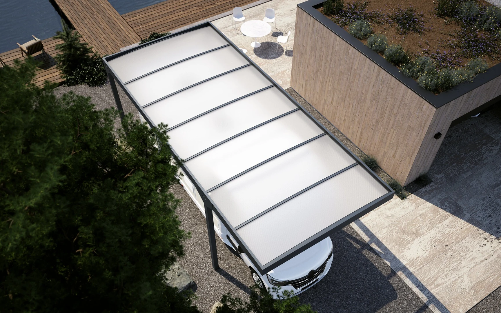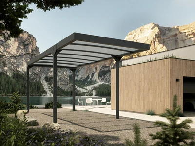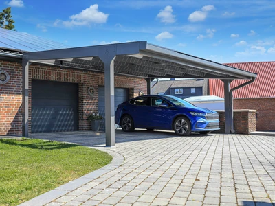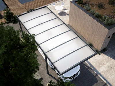 Un CARPORT modern, elegant care protejeaza vehiculul de ploaie, zapada si soare. Structura sa solida din aluminiu si acoperisul din policarbonat translucid ofera protectie durabila si stil.
