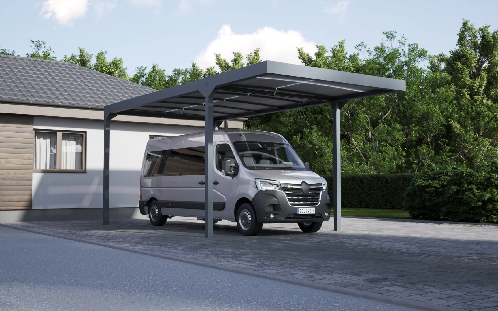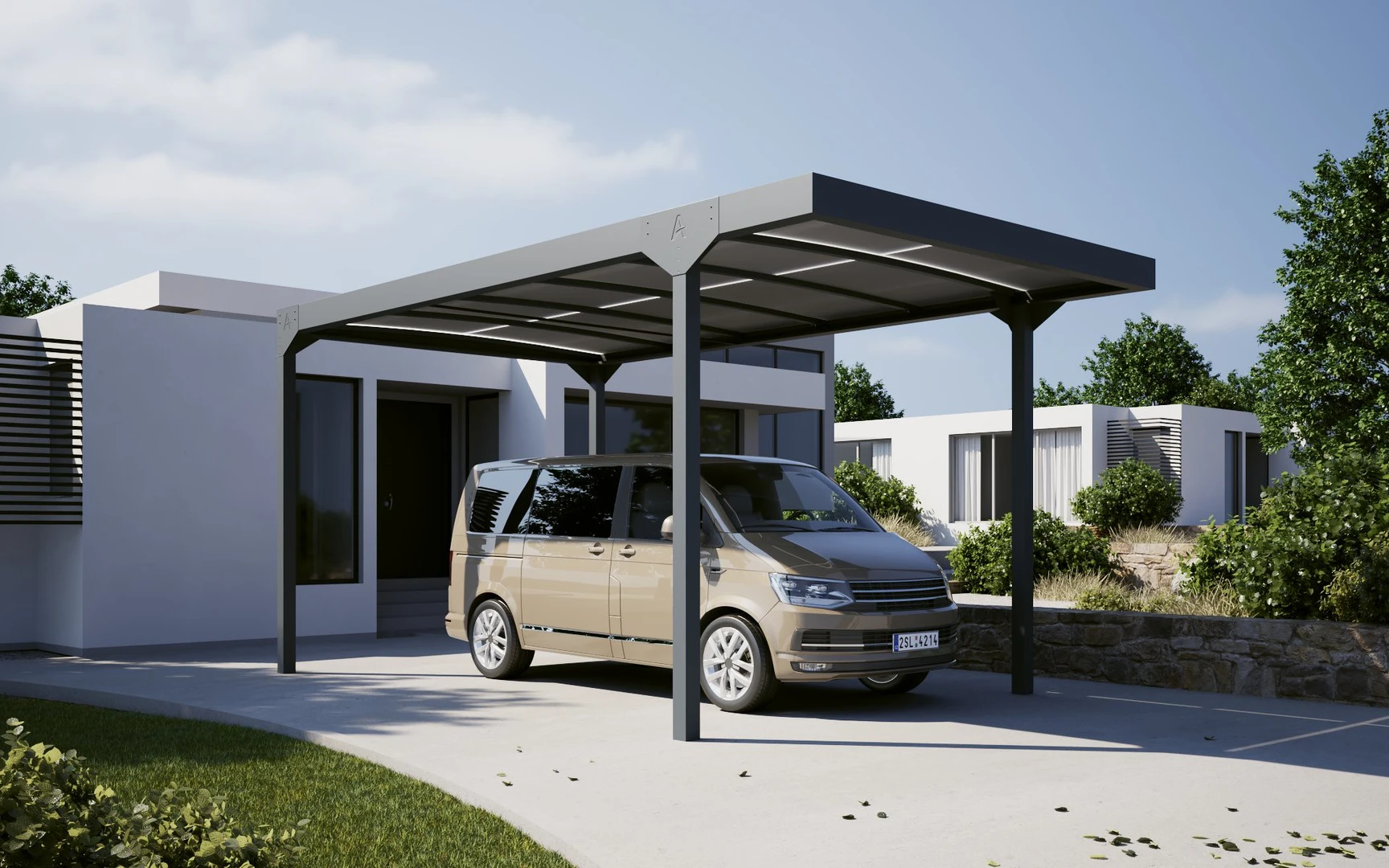 Un CARPORT modern, elegant care protejeaza vehiculul de ploaie, zapada si soare. Structura sa solida din aluminiu si acoperisul din policarbonat translucid ofera protectie durabila si stil.