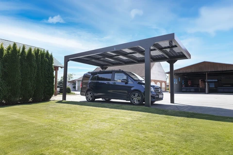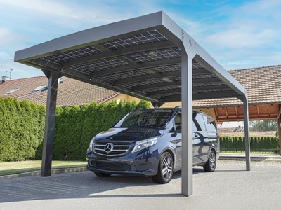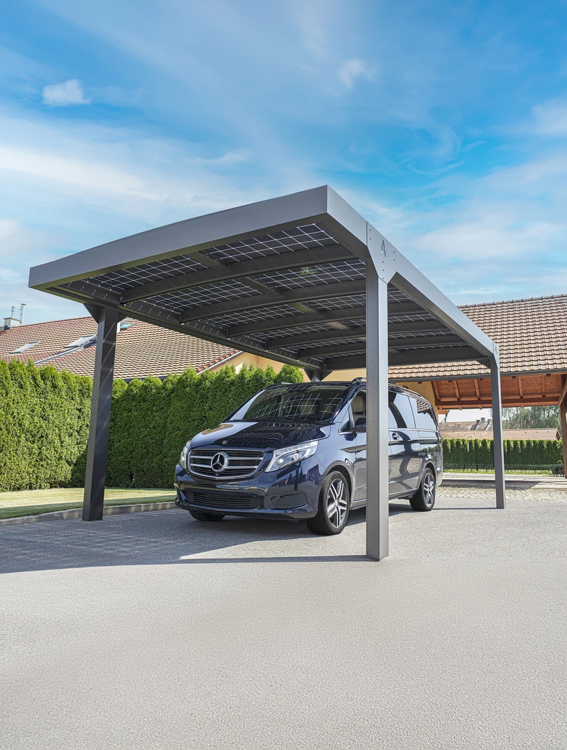 Carport Solar Solid este un spatiu de parcare vehicule, cu panouri solare, culoare antracit, flexibil ca dimensiune si compatibil cu panouri solare cu rama, de. O solutie eficienta, economica si care economiseste spatiu pentru protejarea vehiculelor sau a flotelor, ca alternativa la garajele traditionale.