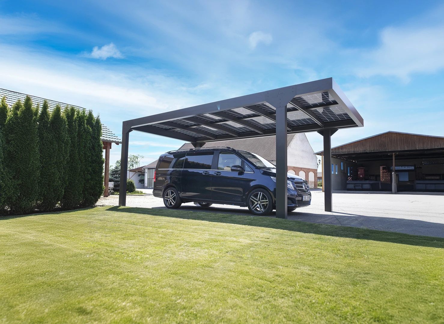 Carport Solar Premium este un spatiu de parcare pentru vehicule de categorie premium, echipat cu panouri fotovoltaice fara rama, bifaciale (sticla pe ambele fete), reprezentand cea mai moderna tehnologie. Designul sau curat si elegant nu este doar estetic, ci si practic: cu jgheaburi integrate si evacuare eficienta a apei pluviale, asigura utilizare de lunga durata fara griji.